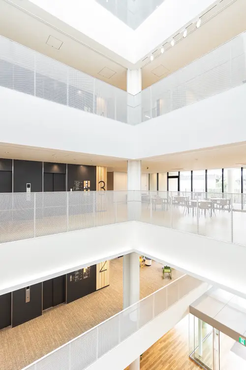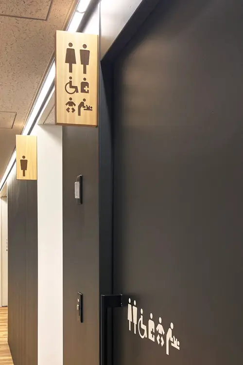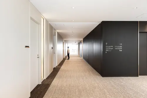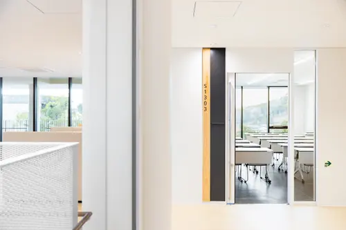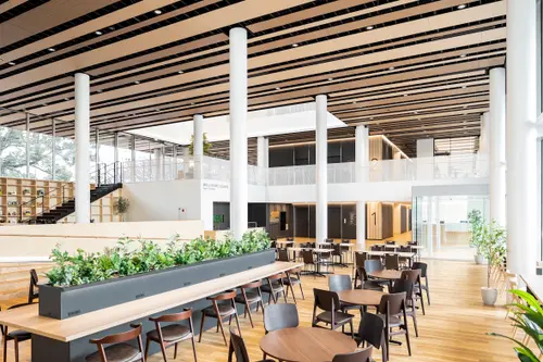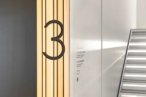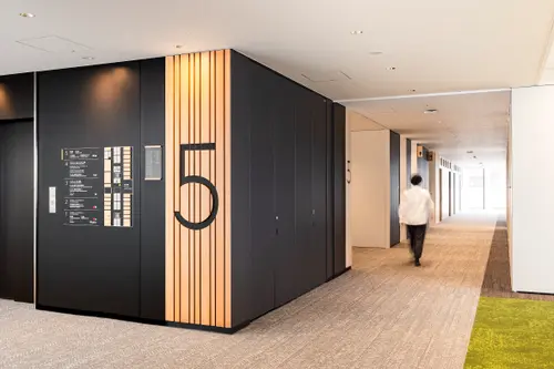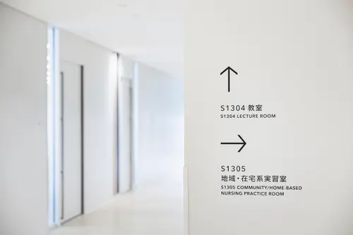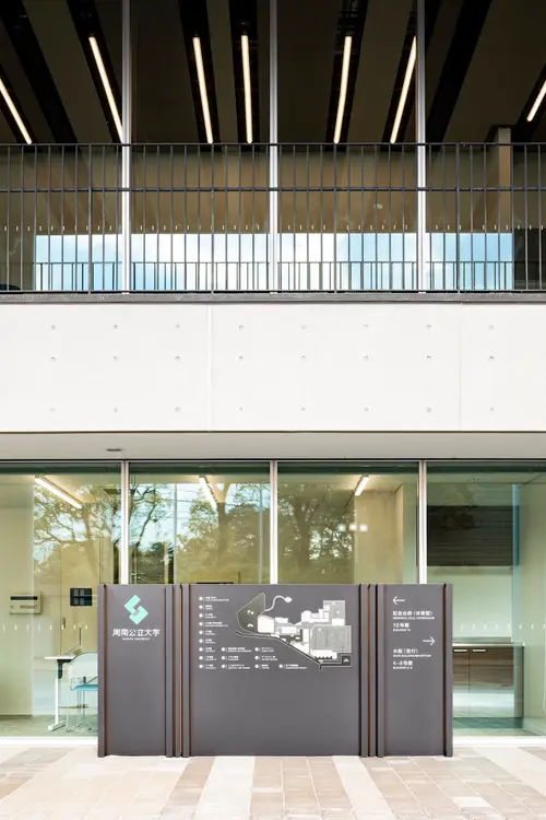 作品意図2022年に公⽴化した周南公⽴⼤学の新講義棟。建築はガラスで囲われた低層と吹き抜けを持ち、水平垂直に伸びやかで明るい。サインはその空間的構造を捉えてデザインし、空間の統合と分かりやすさの両⽴を⽬指した。低層⼤空間の天井の⽔平な流れには、最上階まで貫く県産⽊材のストライプで応えた。垂直動線を含むコア部分はダークグレーで囲むことで、落ち着いたトーンのまま空間の構造を分かりやすくしている。