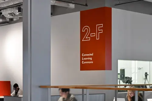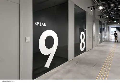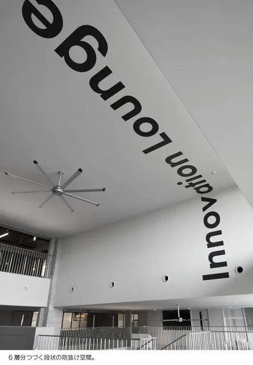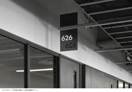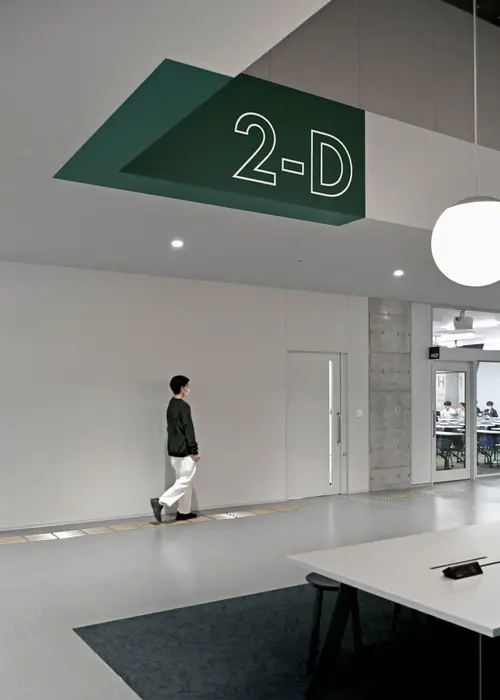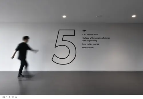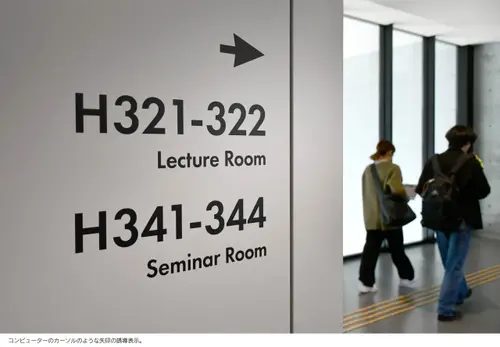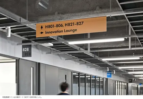 作品意図新設されたH棟は「TRY FIELD」をコンセプトに、一人一人の挑戦を後押しする実証実験の場として計画された。地域に開かれた共創エリア、一般教室エリア、研究室エリアと階層で位置づけされつつも、レイヤーを超えて機能が重なり合う空間構成となっている。サイン計画はそうした多種多様で流動的な場において、それぞれの目的や個性を尊重しつつ、建築空間にラベリングするようなイメージでアドレスや名称を設けた。