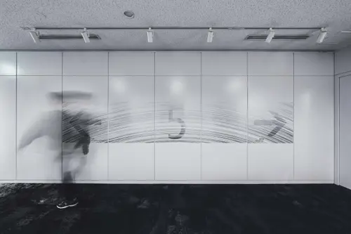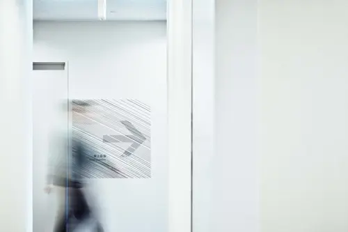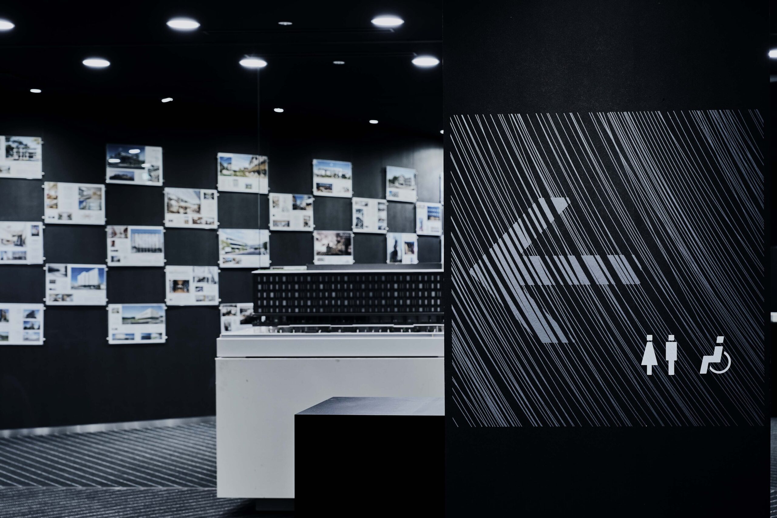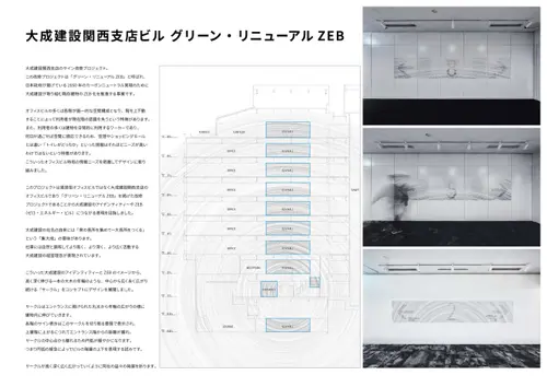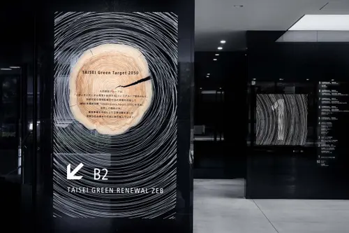 作品意図大成建設関西支店ZEB改修サイン計画。事務所ビルは階を上下動すると現在階の認識を失い易い特徴があるが日常的利用者が多く過度な情報は不要だ。そんな情報ニーズを踏まえつつ大成の社名の“集大成”の意味とZEBから着想し、中心から広がる年輪の様なサークルをテーマにした。エントランスの丸太から全館に広がるサークルを切り取り各表示が表され階によってサークルの中心点との距離が変わり円弧の緩急も変化し階層を表す。