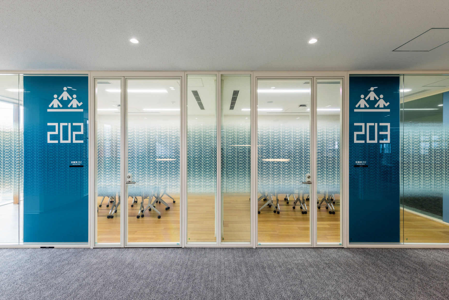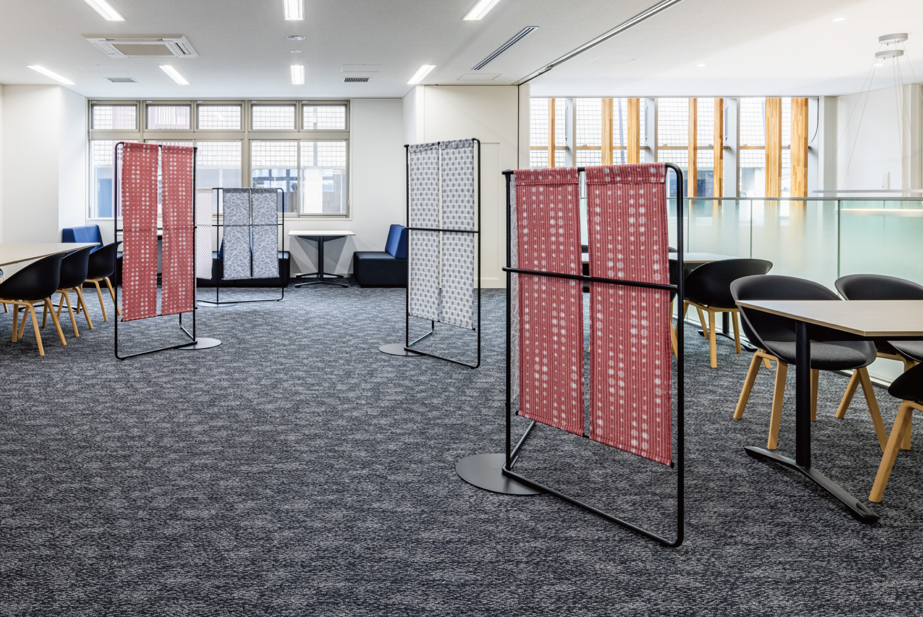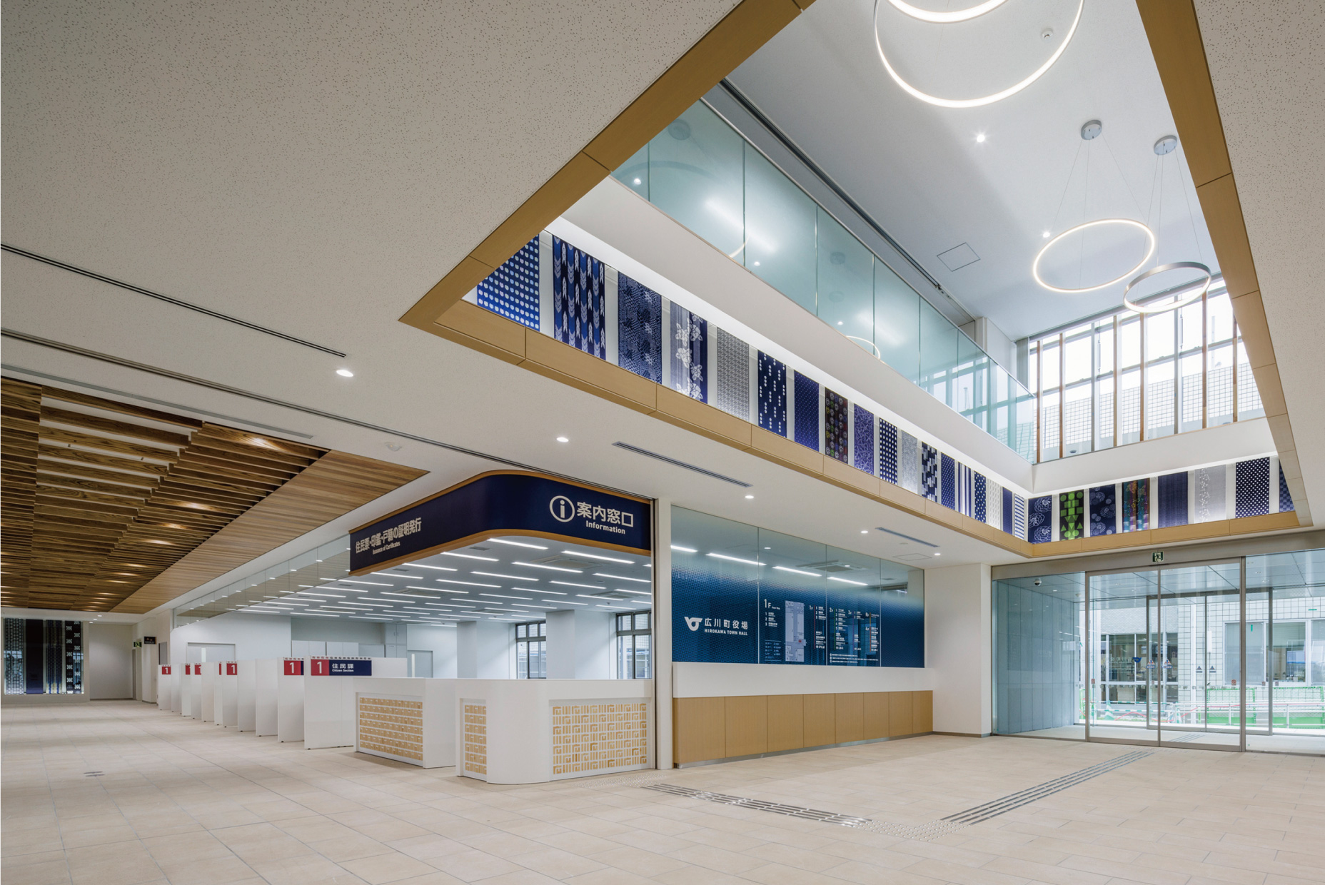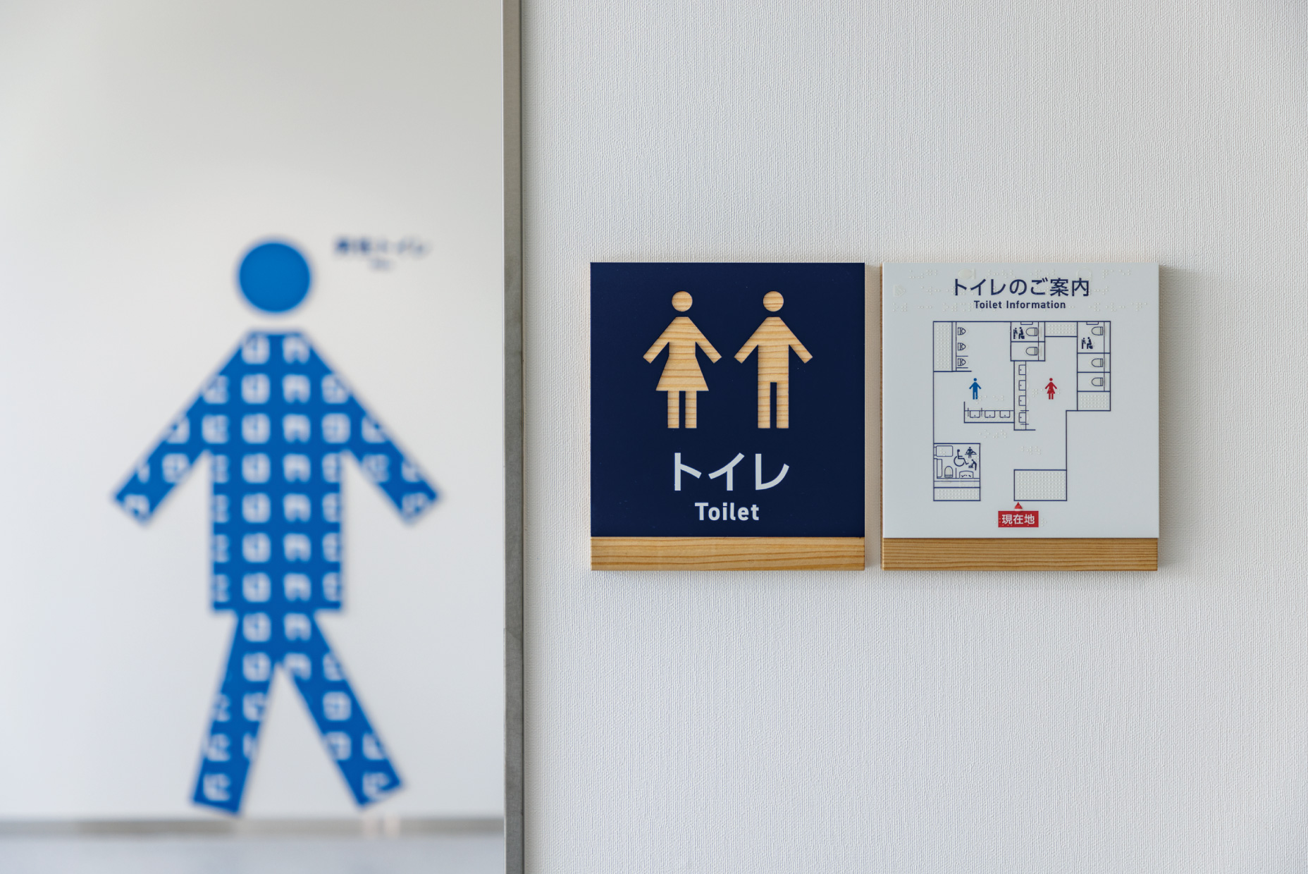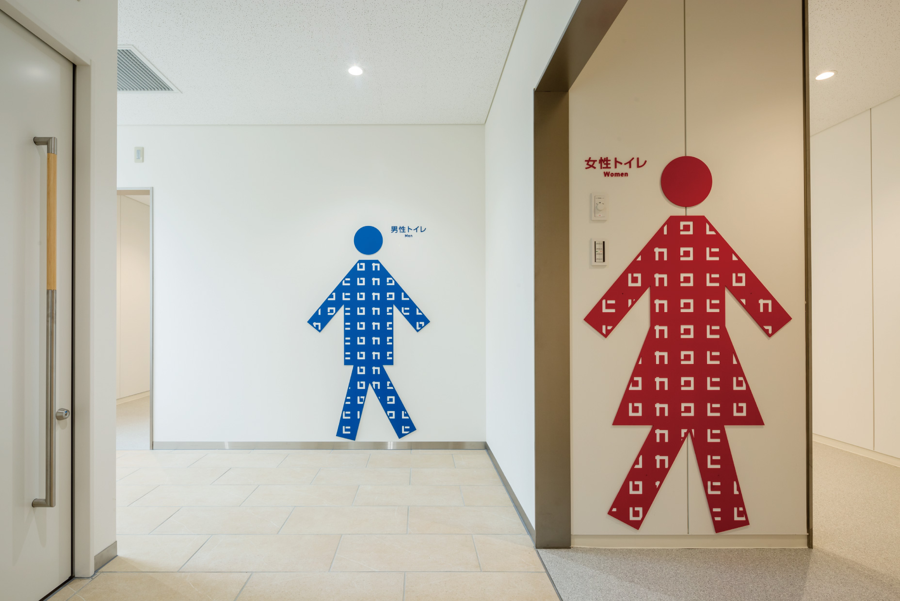 内装には地場産の木材や伝統工芸品を各所に活用し、サインには伝統工芸品である「久留米絣」をイメージした柄や、特産物から設定したフロアカラーを取り入れた。