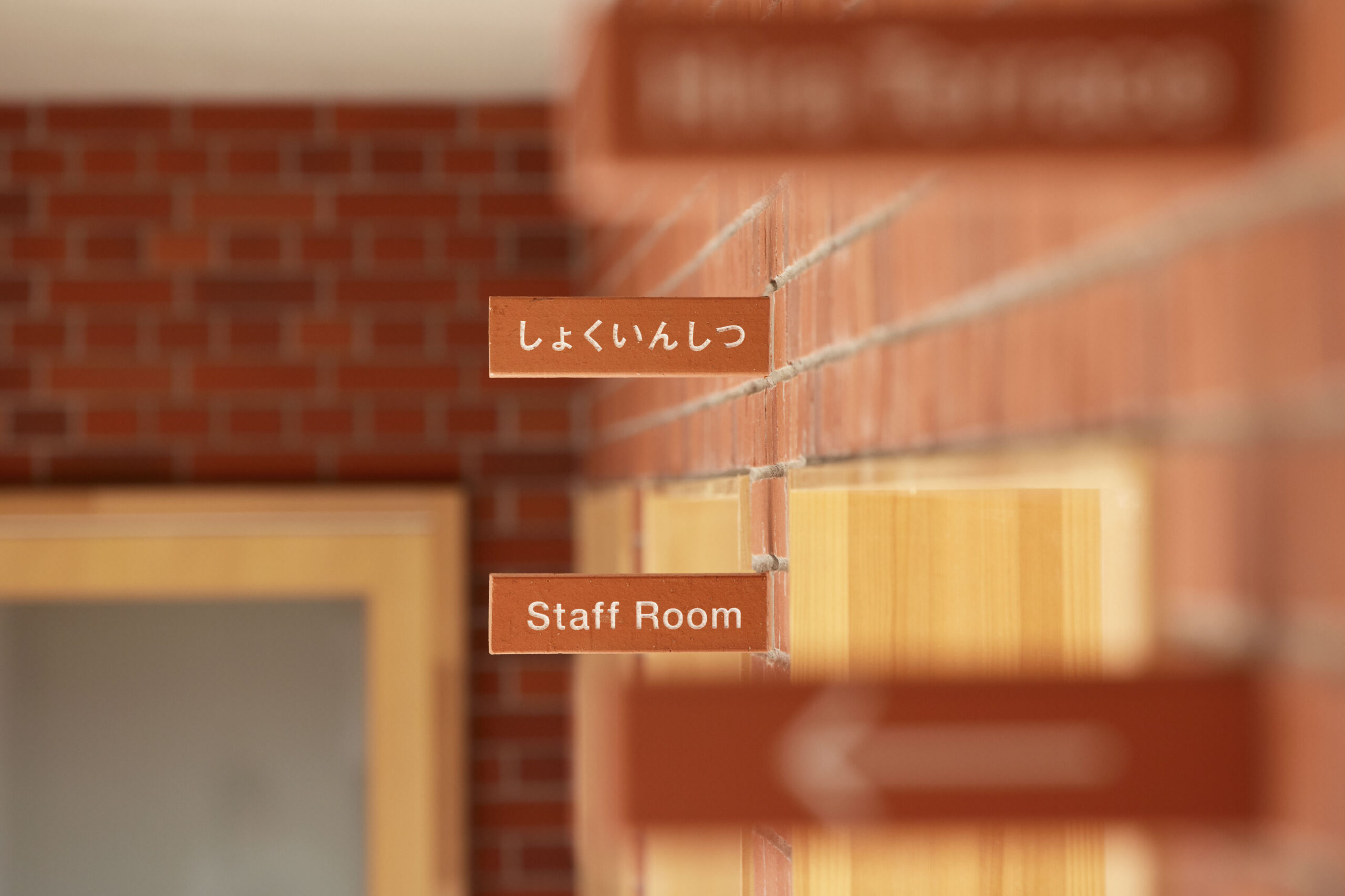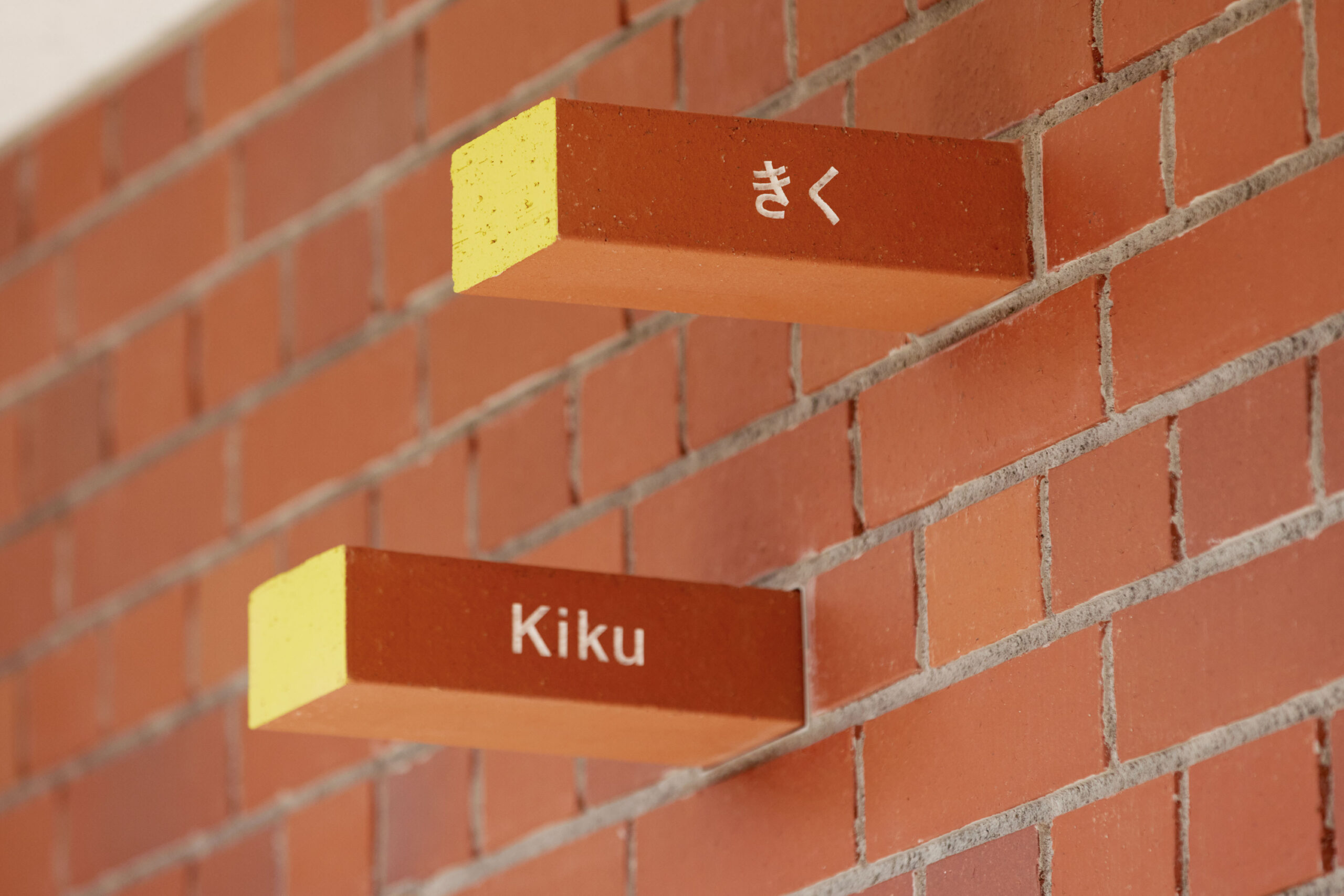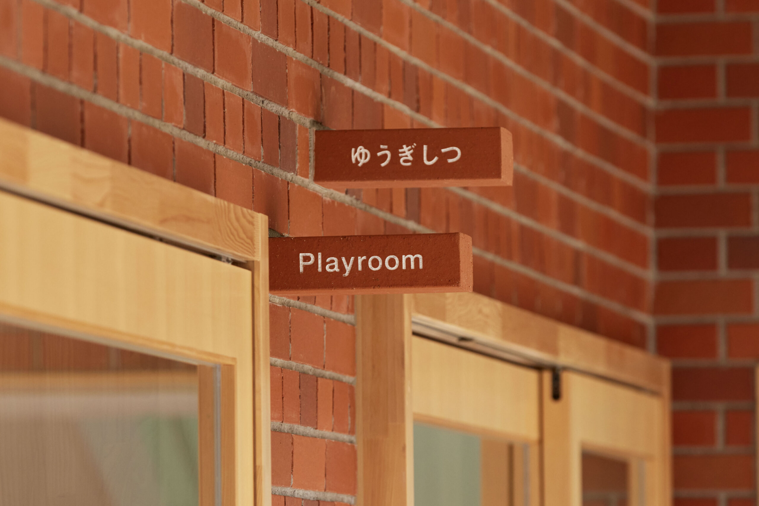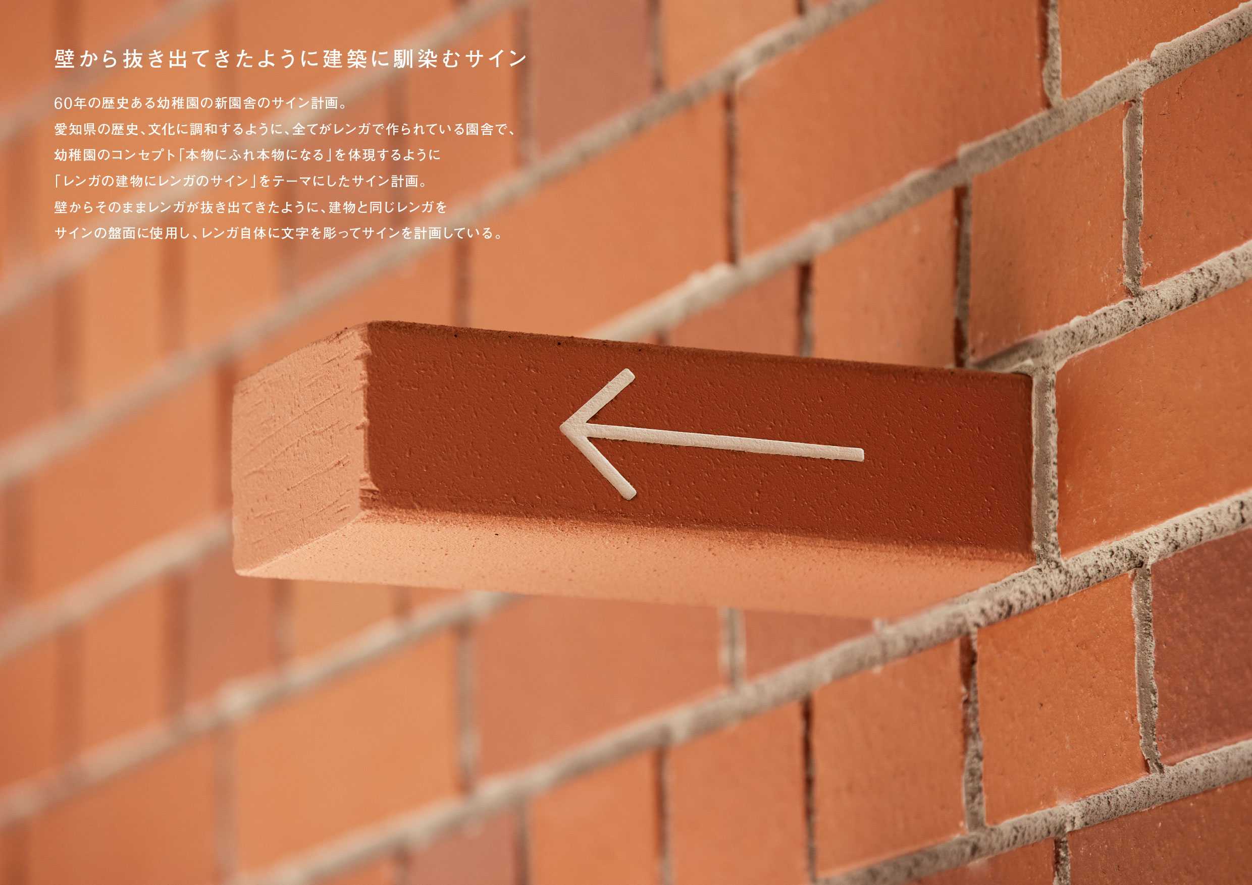 作品意図60年の歴史ある幼稚園の新園舎のサイン計画。 愛知県の歴史、文化に調和するように、全てがレンガで作られている園舎で、幼稚園のコンセプト「本物にふれ本物になる」を体現するように「レンガの建物にレンガのサイン」をテーマにしたサイン計画。壁からそのままレンガが抜き出てきたように、建物と同じレンガをサインの盤面に使用し、レンガ自体に文字を彫ってサインを計画している。