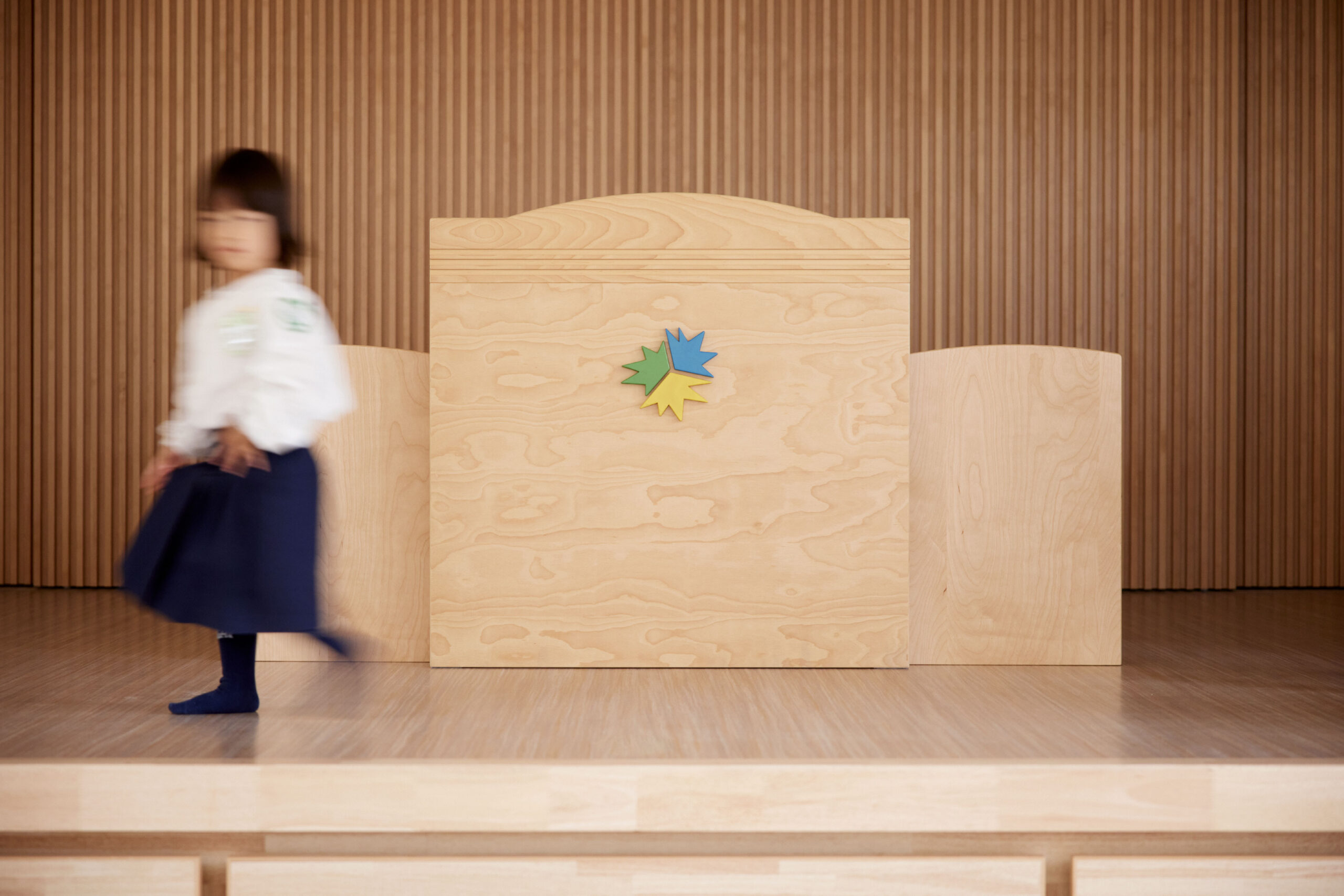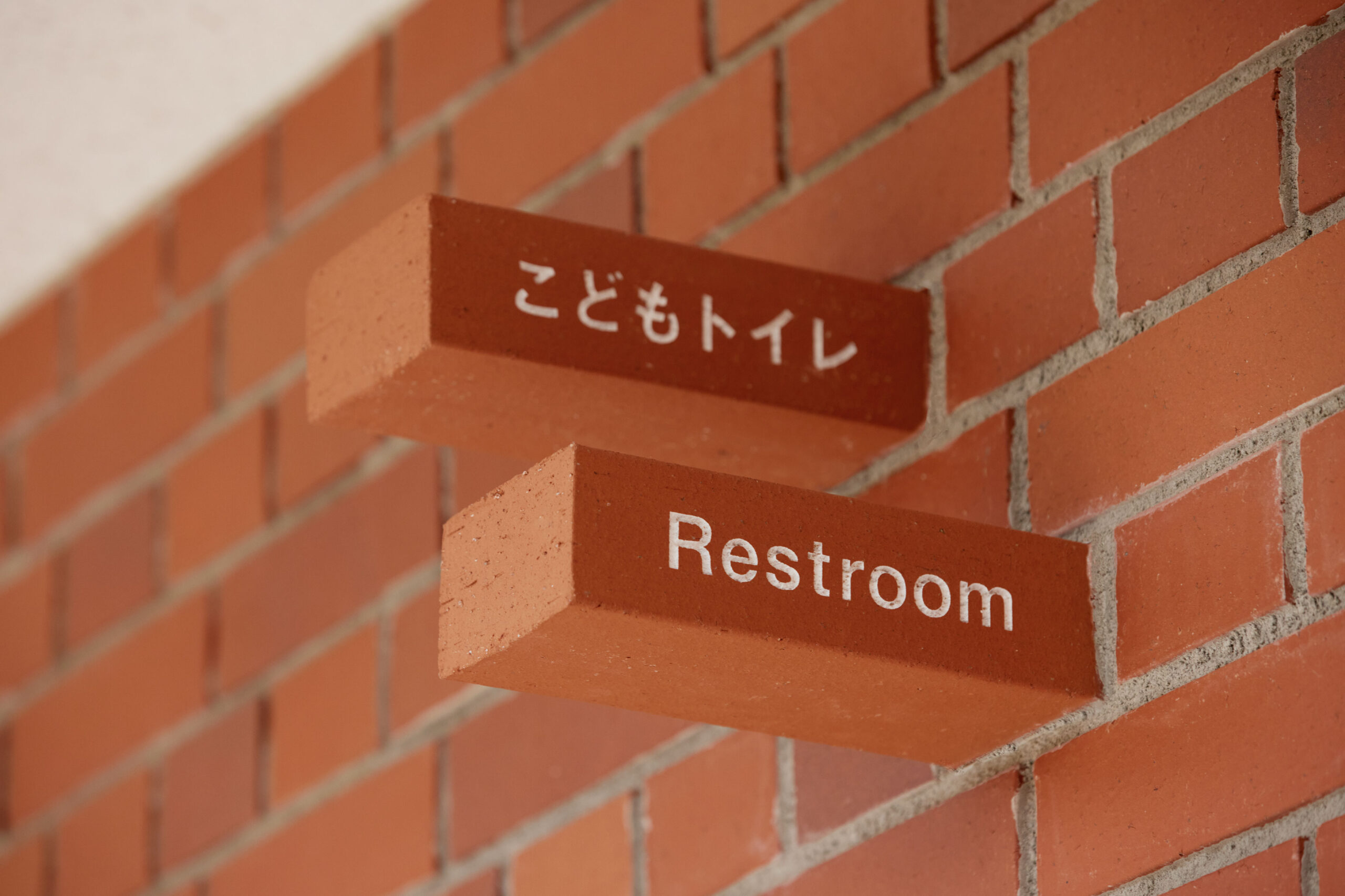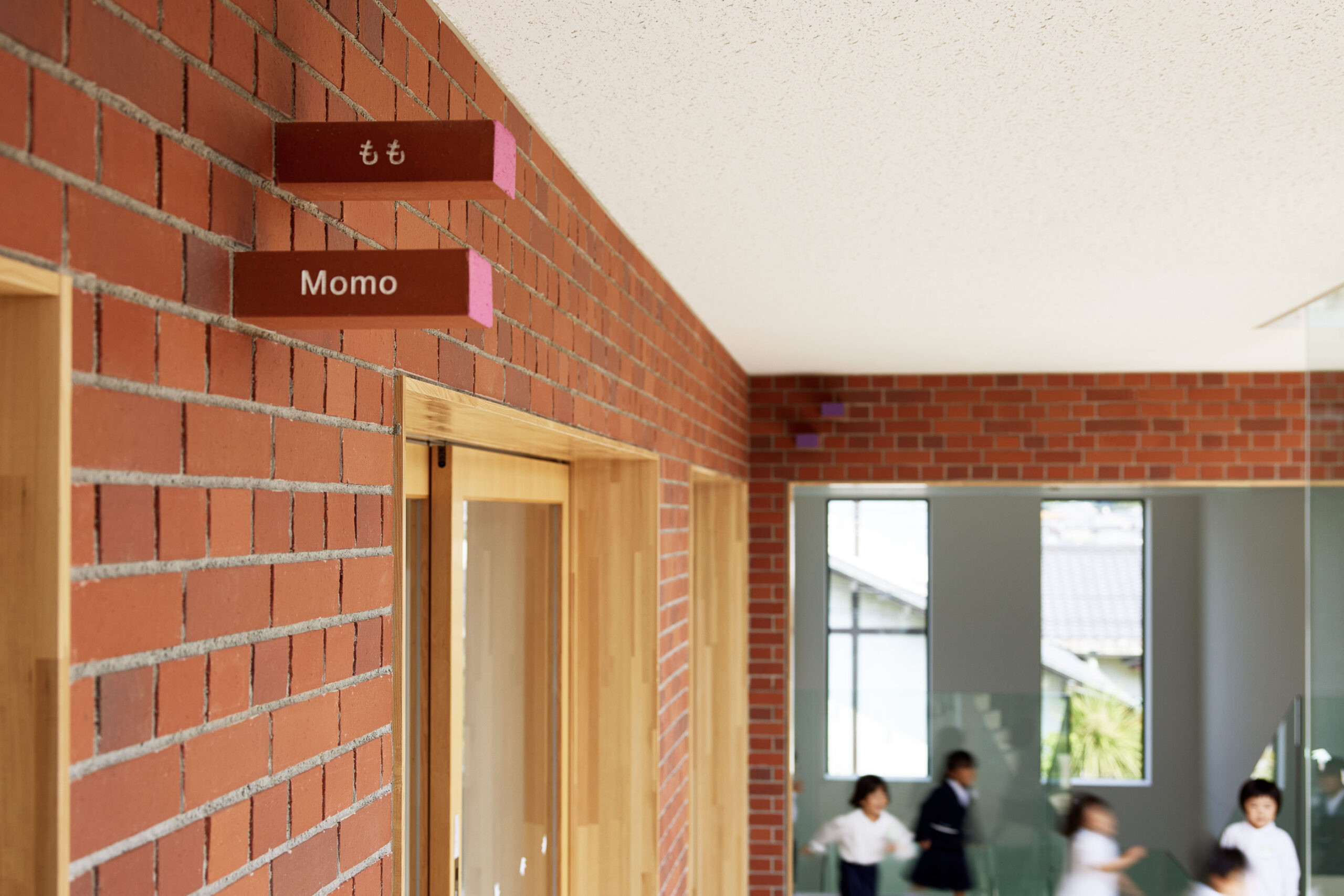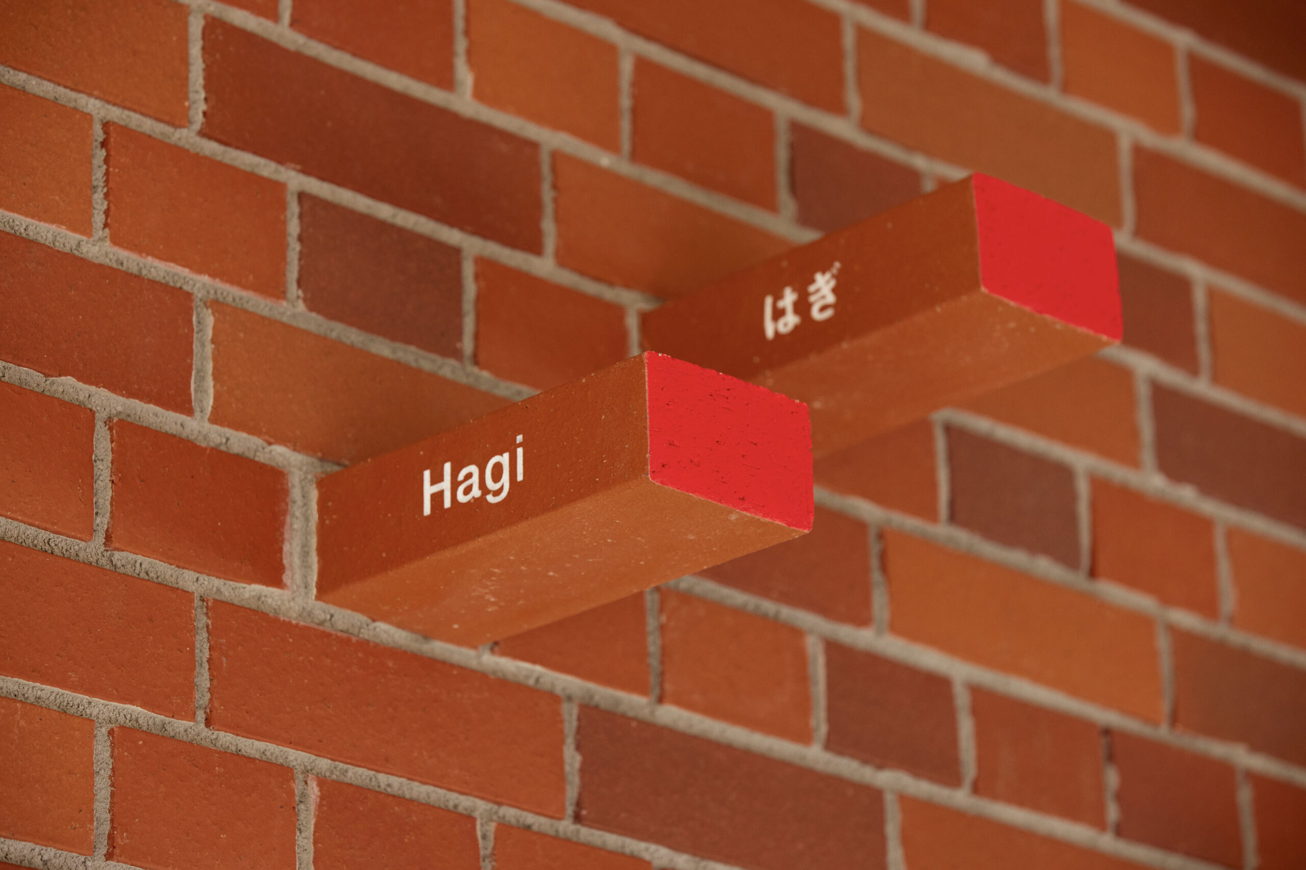 作品意図60年の歴史ある幼稚園の新園舎のサイン計画。 愛知県の歴史、文化に調和するように、全てがレンガで作られている園舎で、幼稚園のコンセプト「本物にふれ本物になる」を体現するように「レンガの建物にレンガのサイン」をテーマにしたサイン計画。壁からそのままレンガが抜き出てきたように、建物と同じレンガをサインの盤面に使用し、レンガ自体に文字を彫ってサインを計画している。