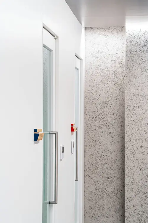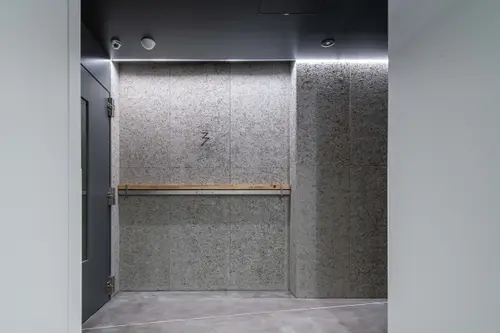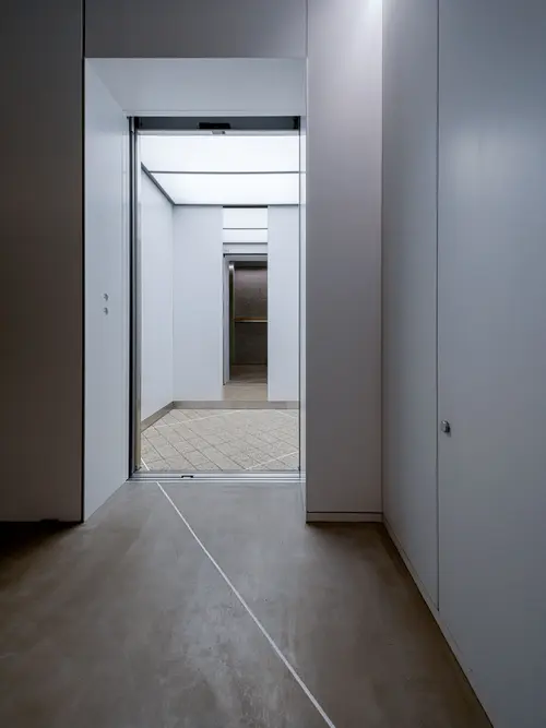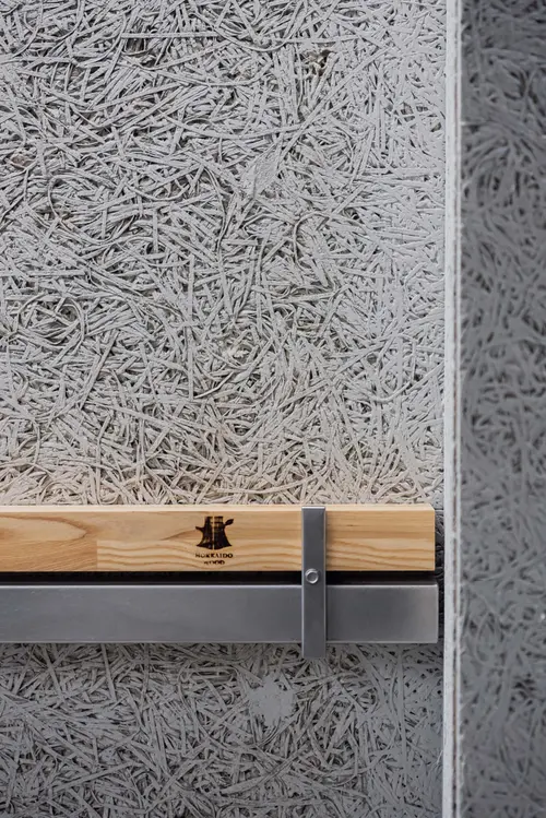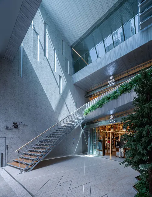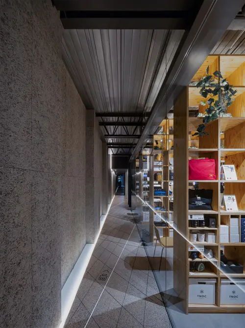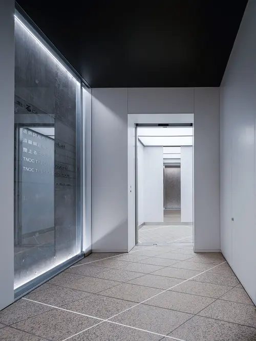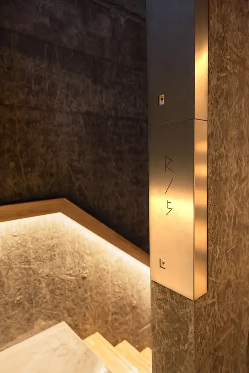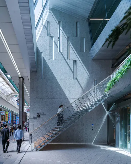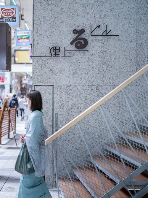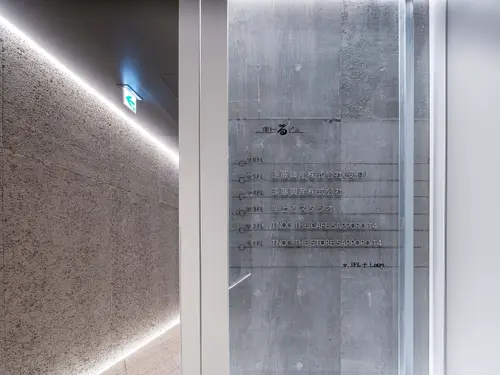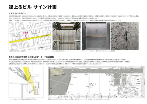 作品意図札幌狸小路商店街の商業ビル。歩行通路から後退した外観が商店街で異質なアトリウムを創出。店舗面積を減らす代わりに寒冷地札幌で貴重な自然光を引込む。人を引込む斜めの床の石割の目地の一部を白くしアトリウムに落ちた光線が建物内へ反射し進みEVへ入り各階店舗へ繫る表現。一筋の目地色のみの最小要素での誘導。打込型枠を採用した建築に添って桟木を利用した店舗表札。WCサインは狸が化ける様に側面と正面で姿を変える。