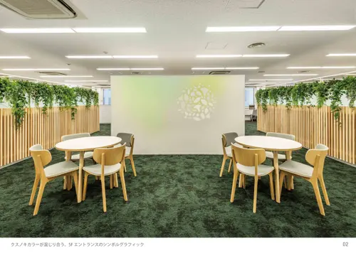 作品意図一人一人の個性が出会い、混じり合い、新しいアイデアを生み出す多様な人、多様な考え方が交流する銀泉大阪本社オフィスのサイン。香りが漂うような、つかみどころのないエアー形状が混じり合うサイングラフィックを各所に展開した。ビルを囲むクスノキ、大川八重桜、大阪御堂筋のシンボルツリー、イチョウの色をほのかに感じ、新しいアイデアが生まれる象徴として、芽生えをモチーフにしたピクトグラムで構成した。
