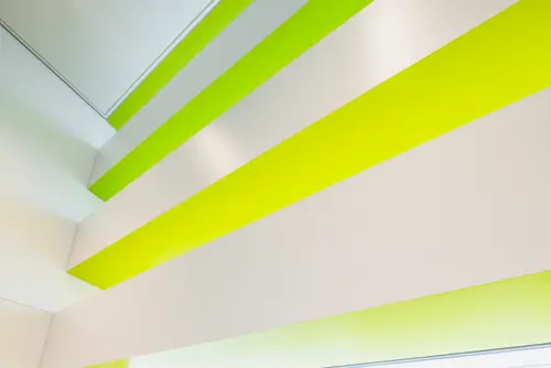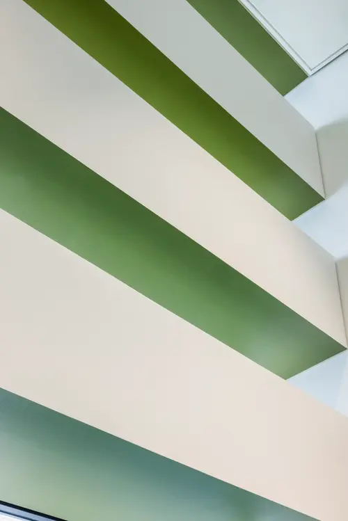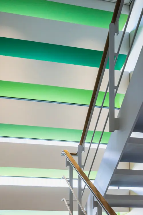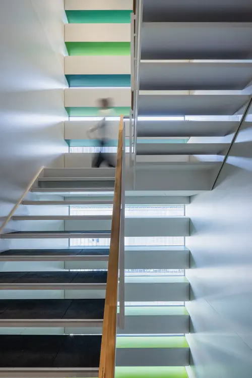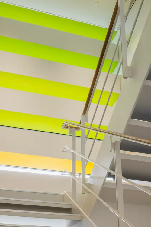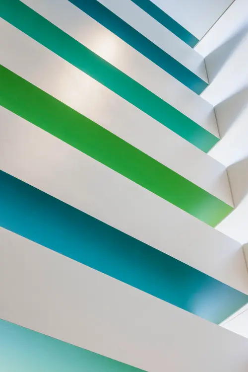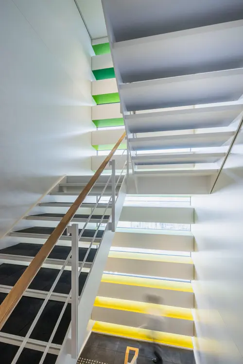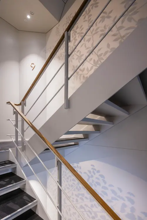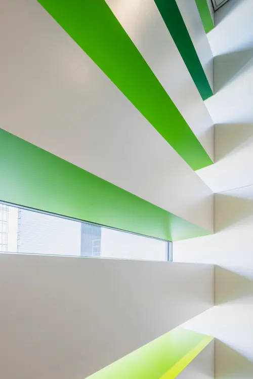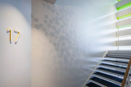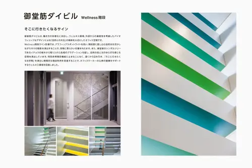 作品意図御堂筋ダイビルWellness階段サインでは、グラフィックスポットライトを用い、階段室に差し込む自然光を活かしながら木々の陰影を演出することで、空間に柔らかい印象を与えます。また、御堂筋のシンボルツリーであるイチョウから取り入れた色相をグラデーションに配し、自然の色と光のゆらぎを感じる空間を演出しています。階段の利用を促進し、オフィスワーカーの心身の健康をサポートするウェルネス環境を目指しました。