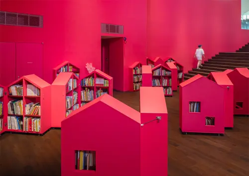 見たことのない空間や不思議な形のオブジェに心が動くことで子どもたちが面白い物語に出会うきっかけの場となるようにつくられています。