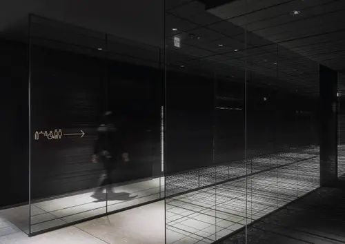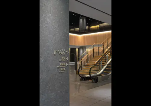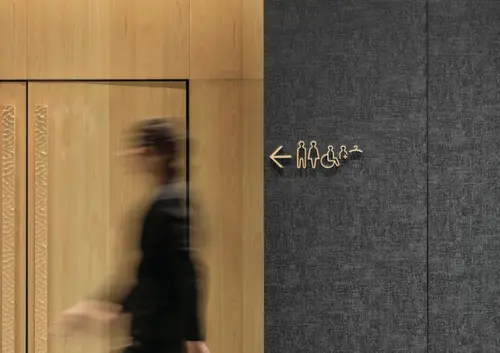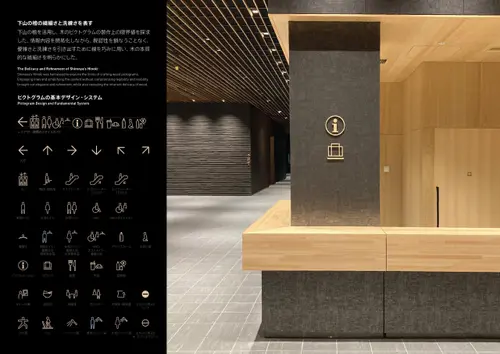 建築空間の質感とゆるやかに調和するために、サインの本体は下山の檜でミニマルに展開し、グラフィックも内観の要素に合わせて線で表現した。人々を導きながら、下山の豊カナ自然環境を想起する事と地域のアイデンティティへの取り組みを強調する。