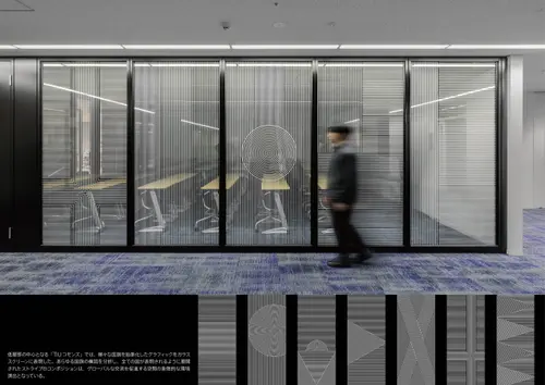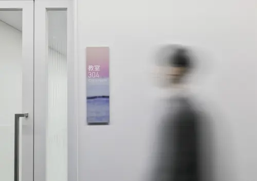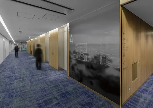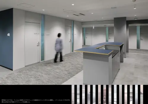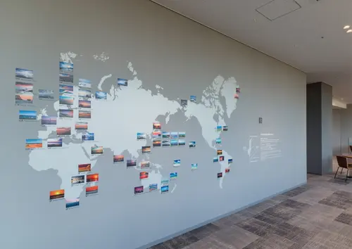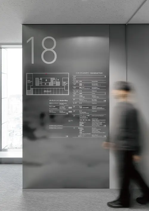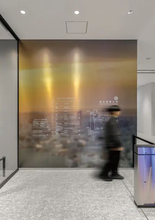 作品意図東京国際大学では100ケ国以上の留学生と共に学ぶ環境を整え、優れた国際的人材の養成に力を入れている。キャンパス内では低層から高層までを地球の緯度になぞらえ、各国から望む水平線のイメージを展開した。各階は東西にゾーン分けされ、視線の先の方角に位置する国々のシーンを配置している。現在地の高さと位置を把握できる337ケ所の仕掛けが、空間のサイン性と独自性を高め、活発なコミュニケーションももたらしている。