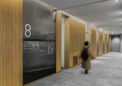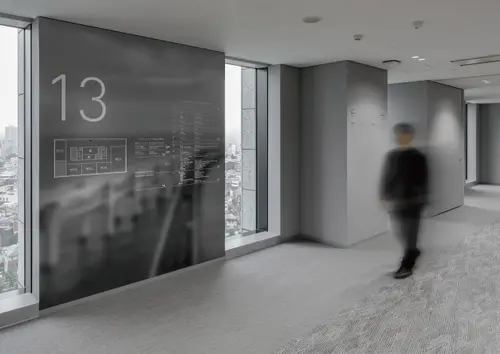 文字情報を控えめにして、各フロアとそのフロアの上での方角によるゾーニングを色調の異なる画像を使って表現しているのがとても新鮮に映る。東側には午前の陽光、西側には夕陽を思わせる色調を選び、無機的な構造の建物の中にいる人間の感覚に働きかけている点が秀逸。