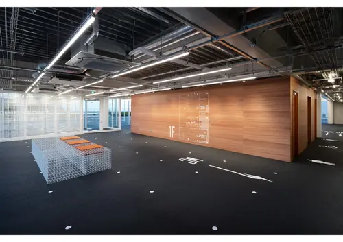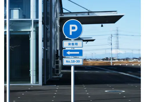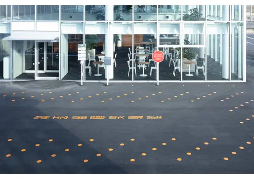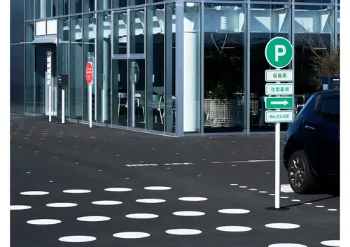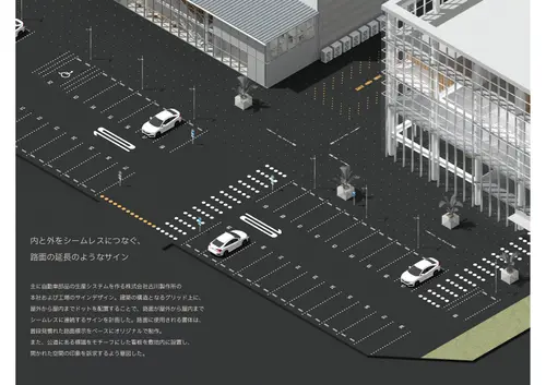 株式会社古川製作所はおもに自動車部品の生産システムなどを作る会社で、受賞した新工場のサイン計画においてまず特徴的なのは、内部から外部にかけて配置されたドットで、この施設の空間の広がり、奥行きがこのサインで生成されているところである。駐車場から、建物の入り口、そして内部に至るまで、道路面が続いているような構成は秩序ある空間を創出している。