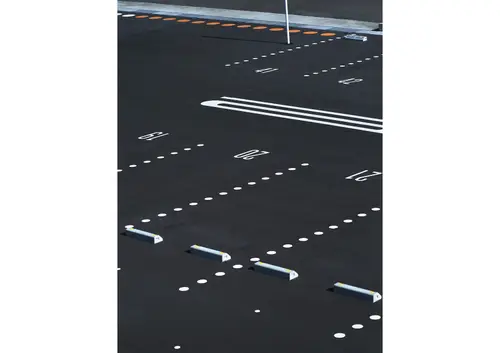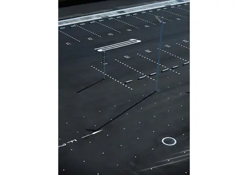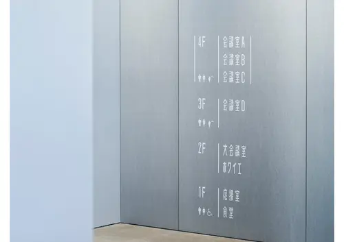 情報という視点で見てみると、道路で見慣れた表示を使っていることがわかる。道路の路面表示は、制限速度や進行方向矢印などがアスファルトにペイントされていて、走っている車の目線から斜めの角度に見えてくる文字や矢印がわかりやすいように細長く変形した文字「長体(ちょうたい)」が使われる。そうした誰もが見た事のある文字であるが、ここでは実に細かく、オリジナル文字として美しく洗練されているのがわかる。そして、この長体文字を内部にも使っているところがユニークで、この施設のアイデンティティにもなっている。