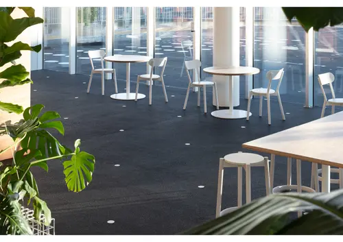 路面表示もそうだが、1本足の道路標識の構成を取り入れた誘導サインは見たことがあるという「既視感」を利用して、空間を邪魔しない。まるで未来の標識のように記号も書体も精密にデザインされている。こうしたサインを実に計画的に、過剰にならず、ちょうど良い色彩、情報量、スケール感、施設全体がバランスよく出来上がっていることについては、とても秀逸なデザインであると言わざるを得ない。