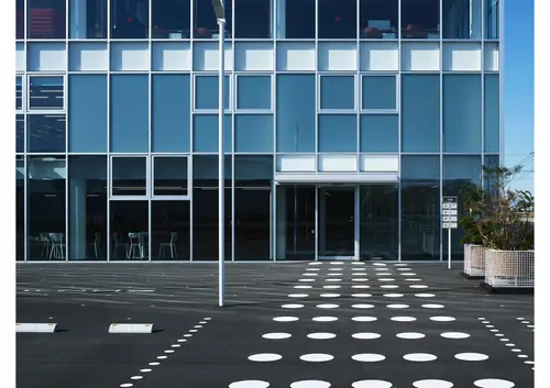 作品意図株式会社古川製作所はおもに自動車部品の生産システムなどを作る会社で、受賞した新工場のサイン計画においてまず特徴的なのは、内部から外部にかけて配置されたドットで、この施設の空間の広がり、奥行きがこのサインで生成されているところである。駐車場から、建物の入り口、そして内部に至るまで、道路面が続いているような構成は秩序ある空間を創出している。