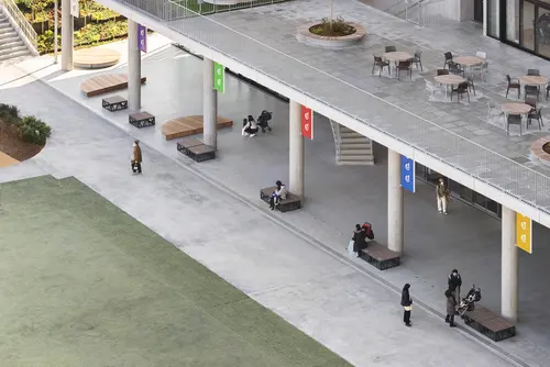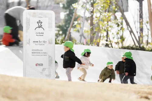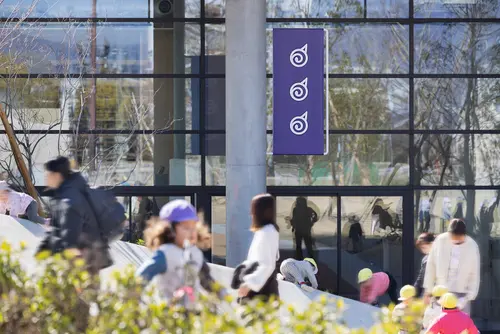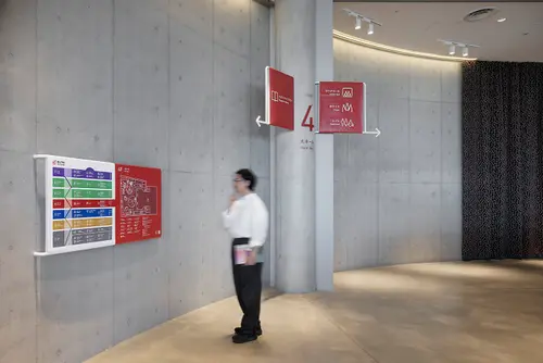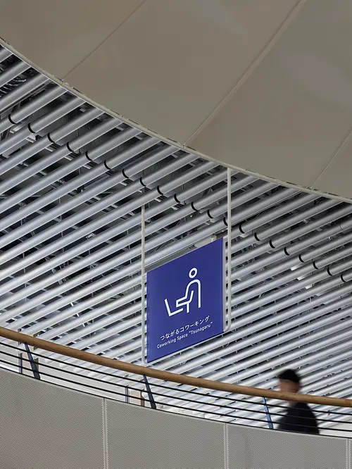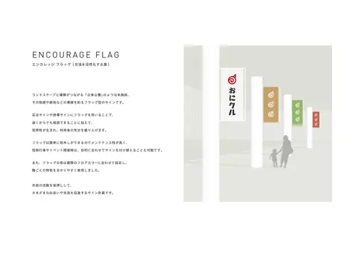 作品意図ランドスケープと建築がつながる「立体公園」のような本施設、その街路を彩るフラッグ型のサインです。定点や誘導サインに旗を用いることで視認性の良さに加えて、祝祭性が生まれ利用者の気分を盛り上げます。フラッグは簡単に着脱可能でメンテナンス性が高く、行事やイベント時は目的に合わせてサインを付け替えることも可能です。また、旗の色は建築のフロアカラーに合わせて設定し、階ごとの特色を分かりやすく表現しました。