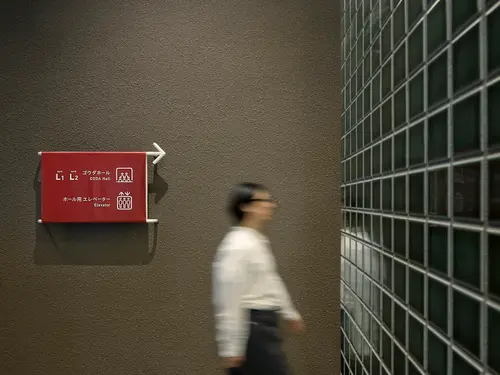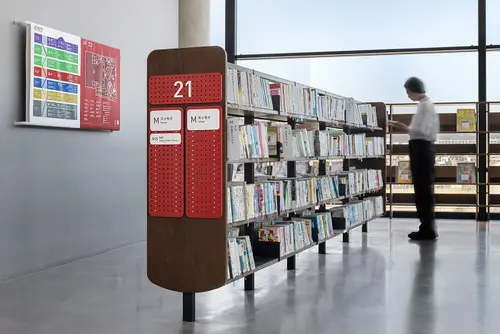各階のテーマカラーを展開し、その場所をわかりやすくしているのは、建築の中の複数の場の理解を高める妥当な方法だが、この作品の色の使い方にはあまり新しさは感じなかった。この作品で特筆する部分は、必要に応じて簡易に付け替えられる軽い素材を用いたフラッグ型の表示と、多種多様なサインフレームの小気味良いポップな造形であろうか。可変性を考慮した軽やかなデザインは、結果としてイベント性や祝祭性を演出するデザインに繋がっている。重い建築に対しての軽やかな情報のコントラストが多層的な施設特性のサインとして心地よい。