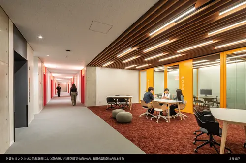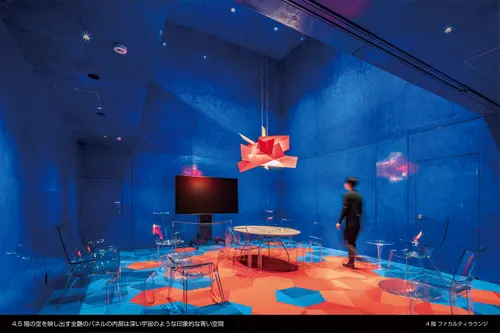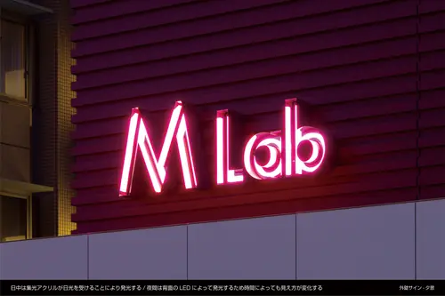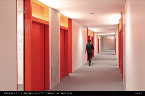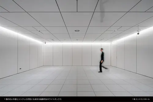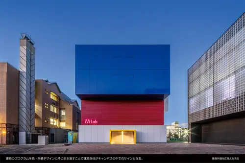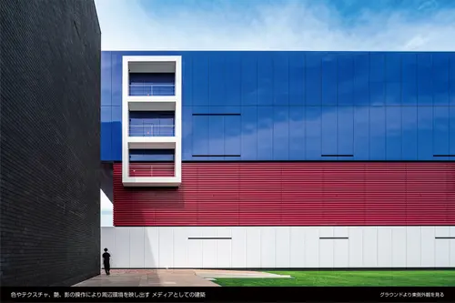 窓の無い箱が積み重なったような外観は、建物の構成・アクティビティを3つの箱として外装デザインに表し、色やテクスチャ、艶、形を箱ごとに変化させることで周囲の環境によりそれぞれの箱は表情を変える。この窓の無い3つの箱は内部のアクティビティを表すサインの建築化であり、周囲の環境をを映し出すメディアの建築化でもある。