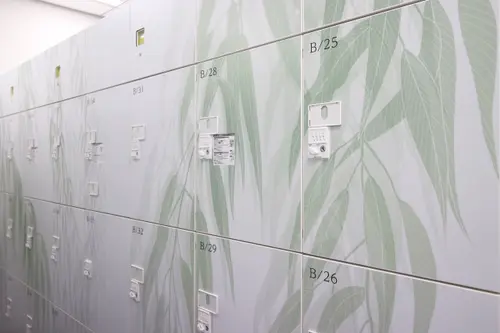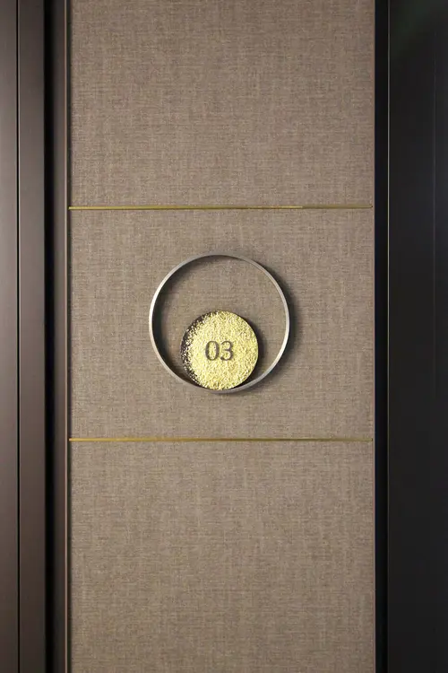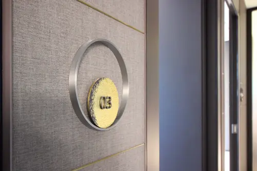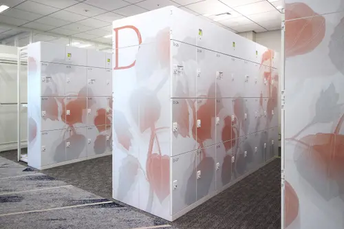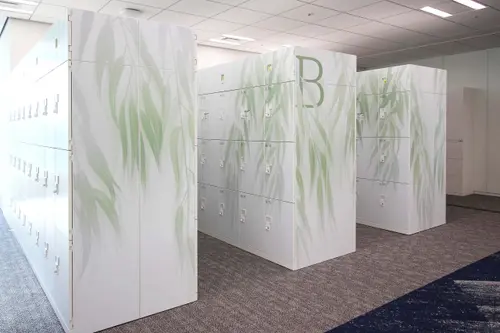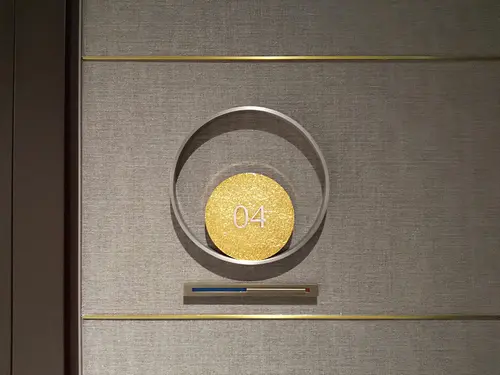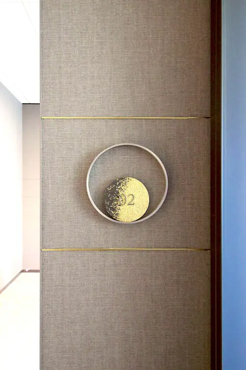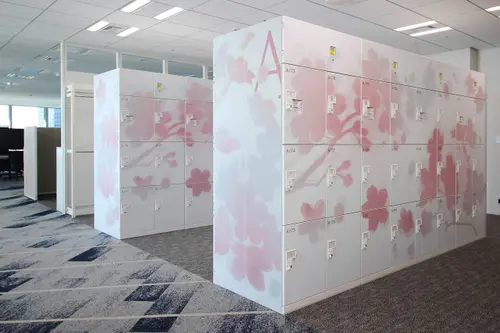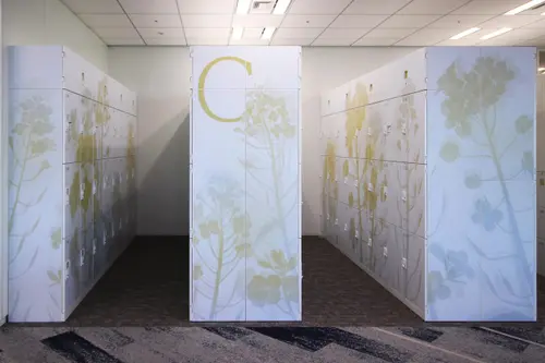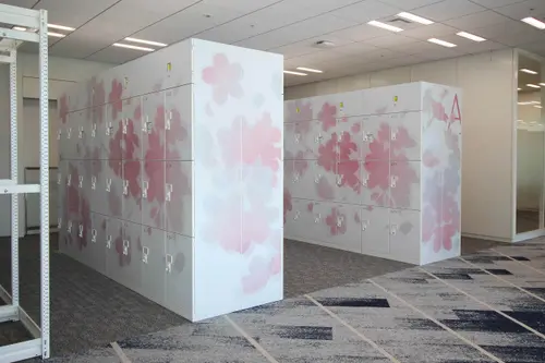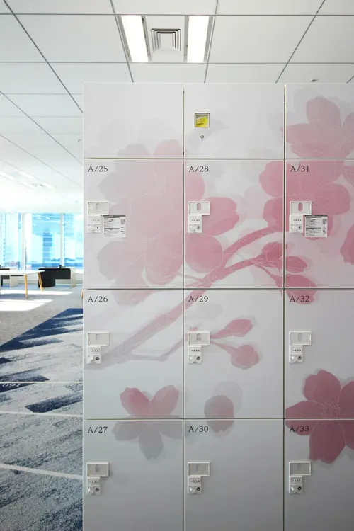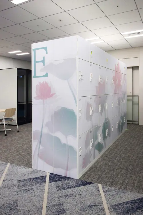 作品意図オフィスのサイン計画。社員用ロッカーにインテリアになじむ優しい色合いの植物柄グラフィックで空間にアクセントを加えている。A〜F郡のロッカーはそれぞれ日本古来からある、八重洲という土地柄やクライアントの伝統・歴史を表す植物をモチーフとしている。また役員室の室名サインは、「時が満ちて」事業の成長を司るという、場の特性を踏まえ、三日月から満月までの「月が満ちてゆく様」を表現しストーリー性を演出している。