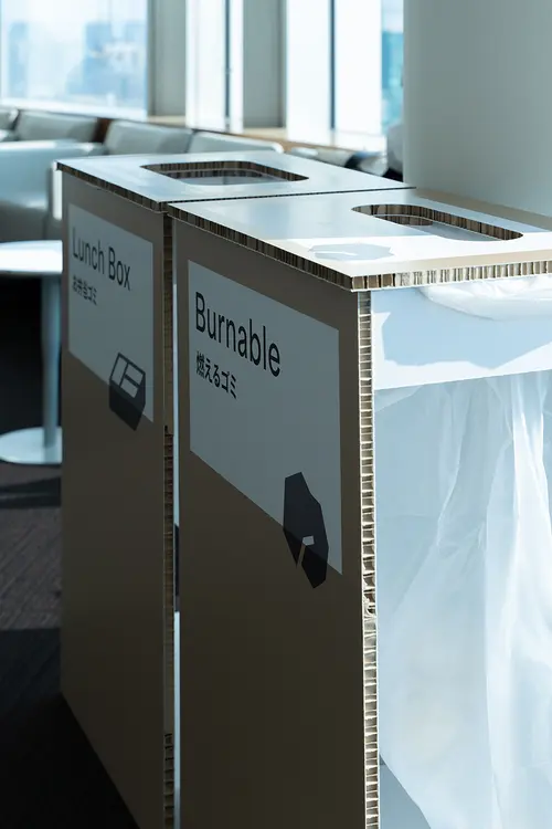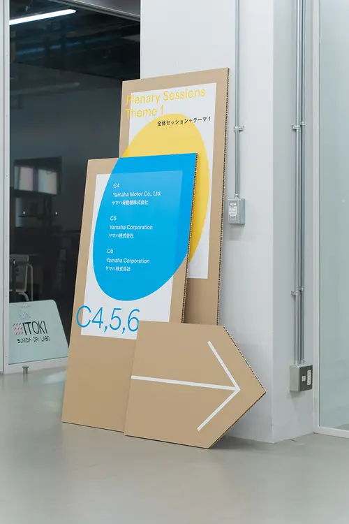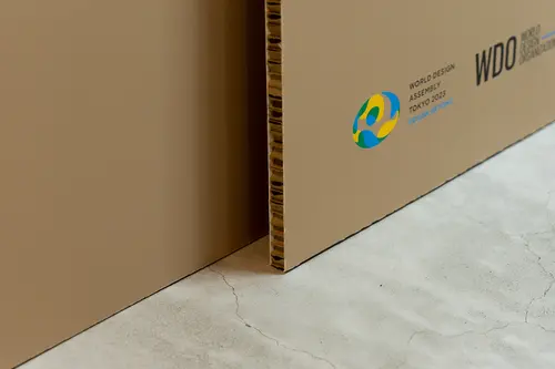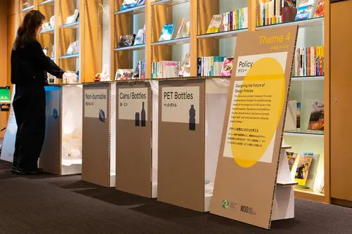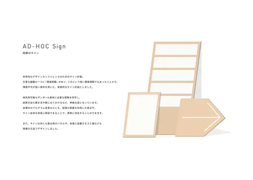 作品意図世界デザイン会議のサイン計画。主要議題の一つに「環境問題」があり、3日という短い開催期間でもあったことから、環境負荷が低い素材を用いた、即興的な計画としました。再利用可能なダンボール素材に情報を印字し、設置方法も置式や壁に立てかけるなど単純な設です。予定変更等にも表裏を利用した表示や本体が容易に移設可能なことで柔軟に対応しました。また、案内以外の展示パネルやゴミ箱も同様の方法でデザインしました。