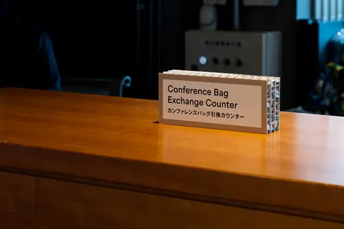 強化段ボールを用いたサインやゴミ箱などがミニマムな構成でつくられている。中には壁や柱に立てかけただけと思われるサインもある。ボードだけで単調になりがちなところを,表示する矢印や階段のグラフィックに合わせて切り抜き加工する,あるいはボードを重ねて置くなど,制限の中で工夫が施されている。メインテーマのひとつに「環境問題ソリューションからデザインを考える」を掲げたデザイン会議のサインとして相応しい。