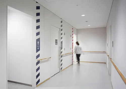 防災という観点から、注意を促す印として無意識に目にとまるゼブラ柄(斜線)を取り入れた。右斜め上に走るラインが、迅速な対応を行う職員の心持ちも表現している。