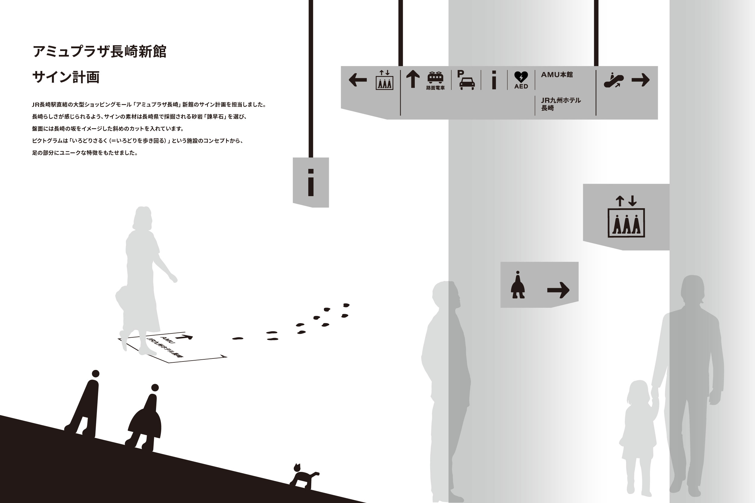 作品意図JR長崎駅直結の大型ショッピングモール「アミュプラザ長崎」新館のサイン計画を担当しました。