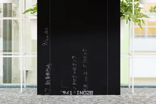 案内やゾーニングのサインには黒皮鉄を用い、塗装は錆止めのみとすることで、 加工時のケガキや後工程の職人に向けた伝達事項の書き込みを残した。