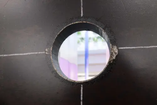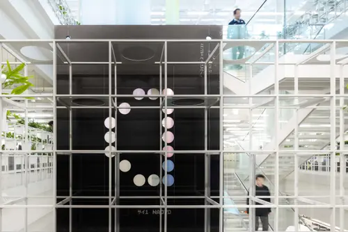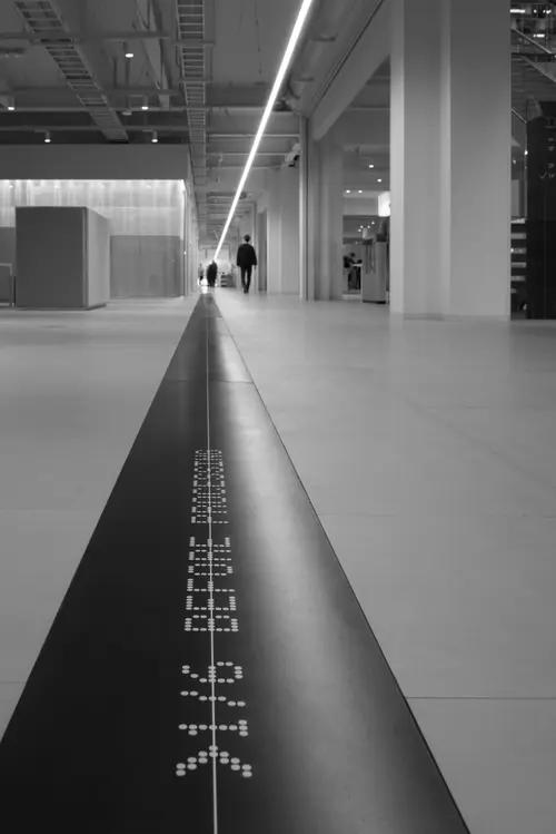 工場で鉄が加工されていくプロセスをサインに痕跡としてリアルに残して普段はあまり馴染みの無いホワイトカラーの事務所棟に展開したこのサインは、工場内だけでなくオフィスにいる社員にも自社の高い技術力で加工した『生』の鉄を身近に感じることができる。それによって、心一つになるという企業ブランドの社内向けのクライテリアにも繋がっている事が素晴らしい。