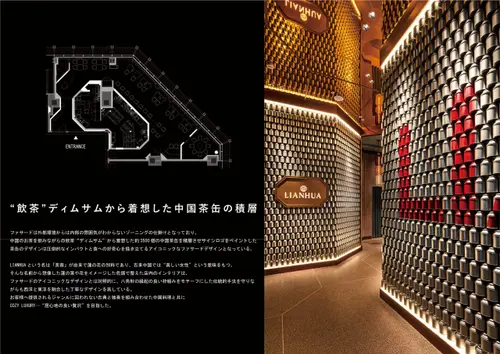 作品意図ファサードは中国のお茶を飲みながらの“飲茶”から着目した中国茶缶を積層させたデザインが好奇心を掻き立てる。