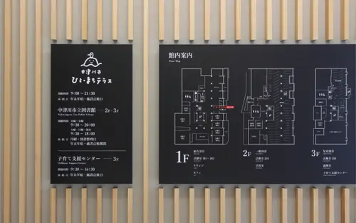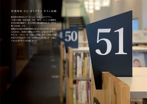 作品意図岐阜県中津川市にオープンした『ひと・まちテラス』。子育て支援・市民交流・学び・観光の4つの機能をまとめた複合施設で、多くの人々が訪れる「学びと集いの広場」です。建物は中山道の宿場町建築に見られる木のデザインを取り入れた、街並みに馴染んだデザインとなっています。サインも「うだつ」や「立札」「石畳」など、中津川に溢れるアイテムをモチーフに“中津川らしさや親しみ”を感じてもらえるデザインを目指しました。