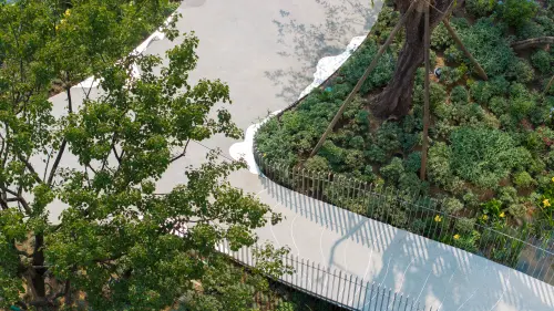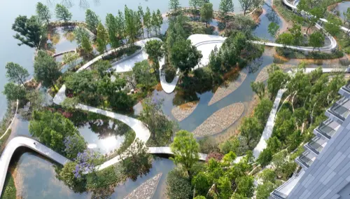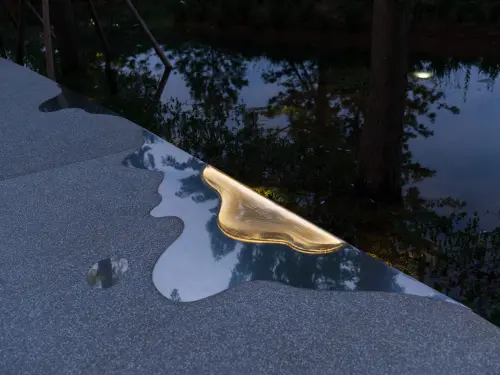 作品意図環水公園は中国成都の麓湖にあり、線状の活水公園である。その形は、川の末端に堆積した砂州のようであり、湖の中に島々が交錯して育っている。公園を貫く歩道があり、そこを歩くとまるで水面にいるかのような感覚が味わえる。当作品は、広がり、激しさ、交錯という3つの水の形態をデザインに取り入れ、人と水の距離を縮め、水辺のアートギャラリーに立ち並ぶような臨場感を訪れる人々に提供している。