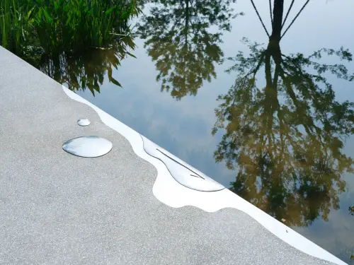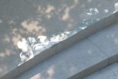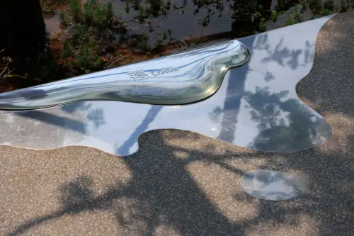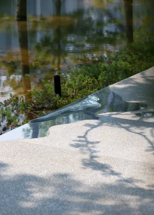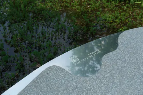中国成都の環水公園の遊歩道に設けられたサインであるが、まず遊歩道自体に手すりが無いのが素晴らしい。サイン自体も遊歩道の歩道面に設けられ、遊歩道を歩く時の水面にいるかのような感覚を損わないようにできているのも良い。遊歩道のエッジにたまった水たまりのようなサインは、風景を写し込み、静かにその存在を主張していて美しい。夜も水が光を湛えたように見え、美しそうである。このサインがあることで、人は歩く時によりエッジに注意を向けることになるであろう。