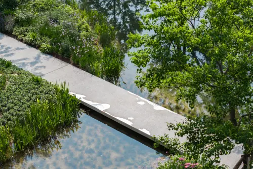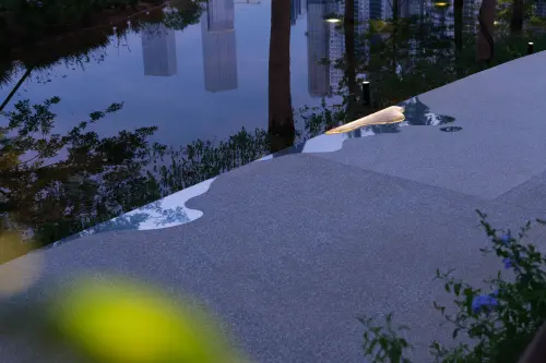この歩道は環水公園を貫いていて、部分的に水面と接した植物に覆われながら緩やかに、曖昧な境界を示しながらゆったりと散歩を楽しめるように計画されている。日本であれば実現が難しそうな自由さと危うさを持っていることも魅力につながり、夕方からは一部が発光することで、境界を示しながら公園の表情を変化させ、日中とは異なる表情も見せてくれる。水を表現する素材を多種使い、新たなデザインを開拓していると評価された。