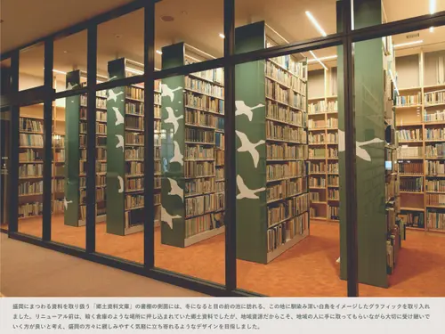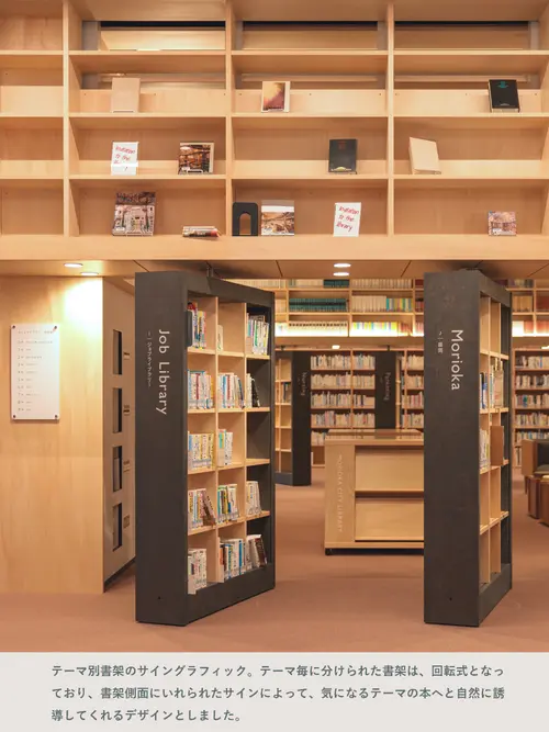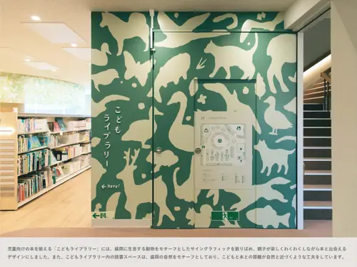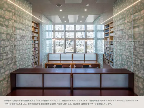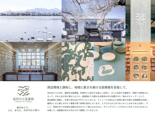 作品意図池のほとりに佇む、盛岡市立図書館。四季折々に変化する美しい自然と、そこに生息する動物や、飛来する野鳥たちの姿が目の前にひろがります。図書館をこの豊カナ生態系の中に位置付け、「知のビオトープ/知がめぐり、人と、まちと、のびやかに育つ図書館」として、周辺環境と調和を図るデザインにしました。こどもから大人まで、地域に愛され続ける図書館を目指し、盛岡らしさと親しみやすく愛着が沸く表現を追求しました。