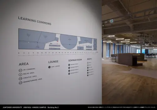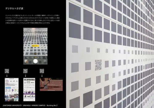 建設中のⅢ期棟も含め「光と影」をテーマにしているサイン計画。目の前に広がる浦安日の出海岸の潮風に揺らぐさざ波の光と影が2号館のキャンパスに映り込むイメージを健康データサイエンス学部らしくデジタル感を加え、躍動感のある空間を創出した。