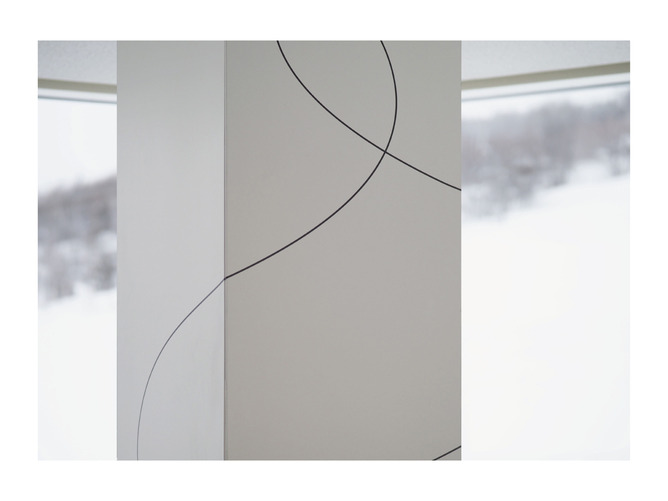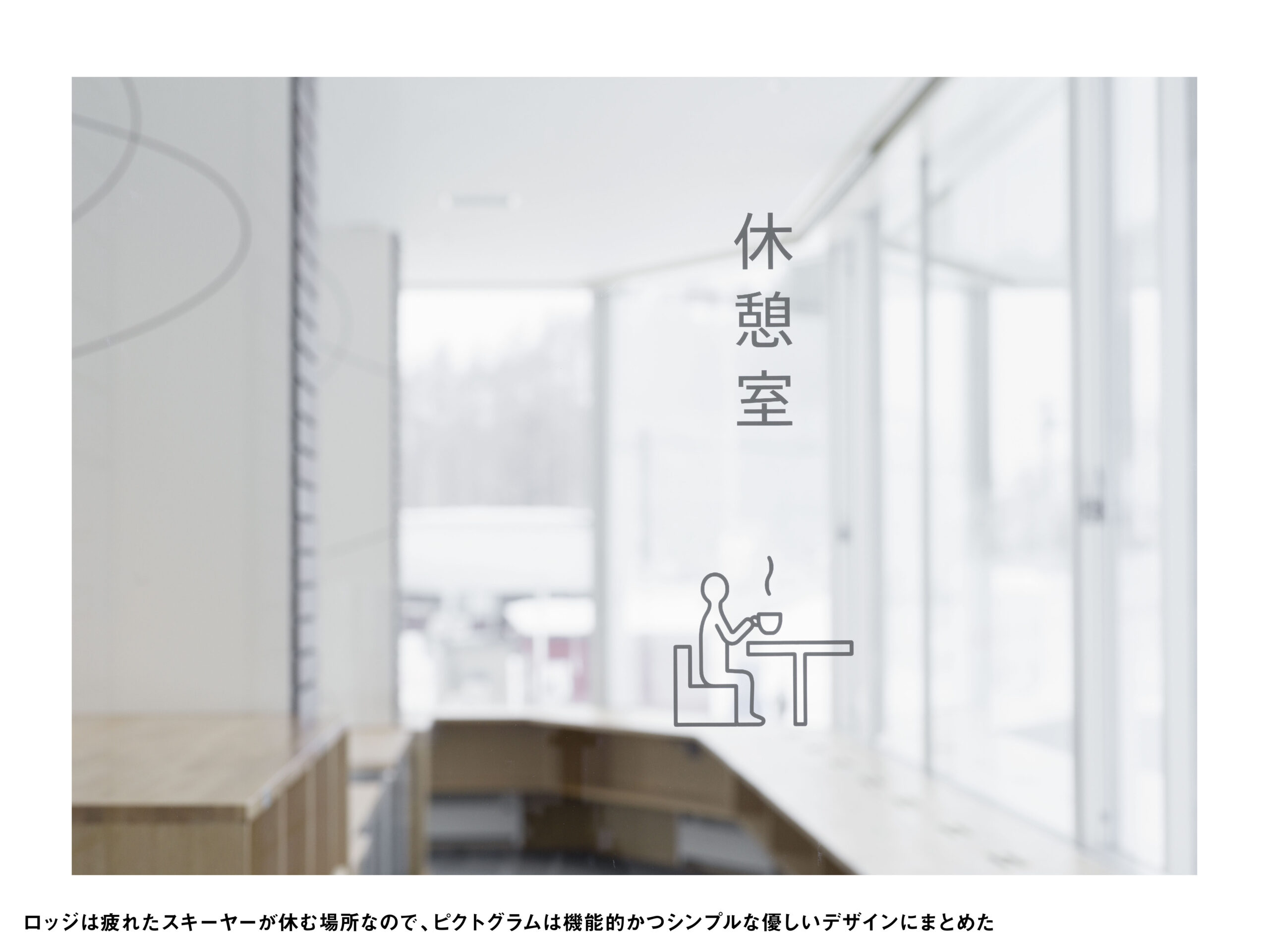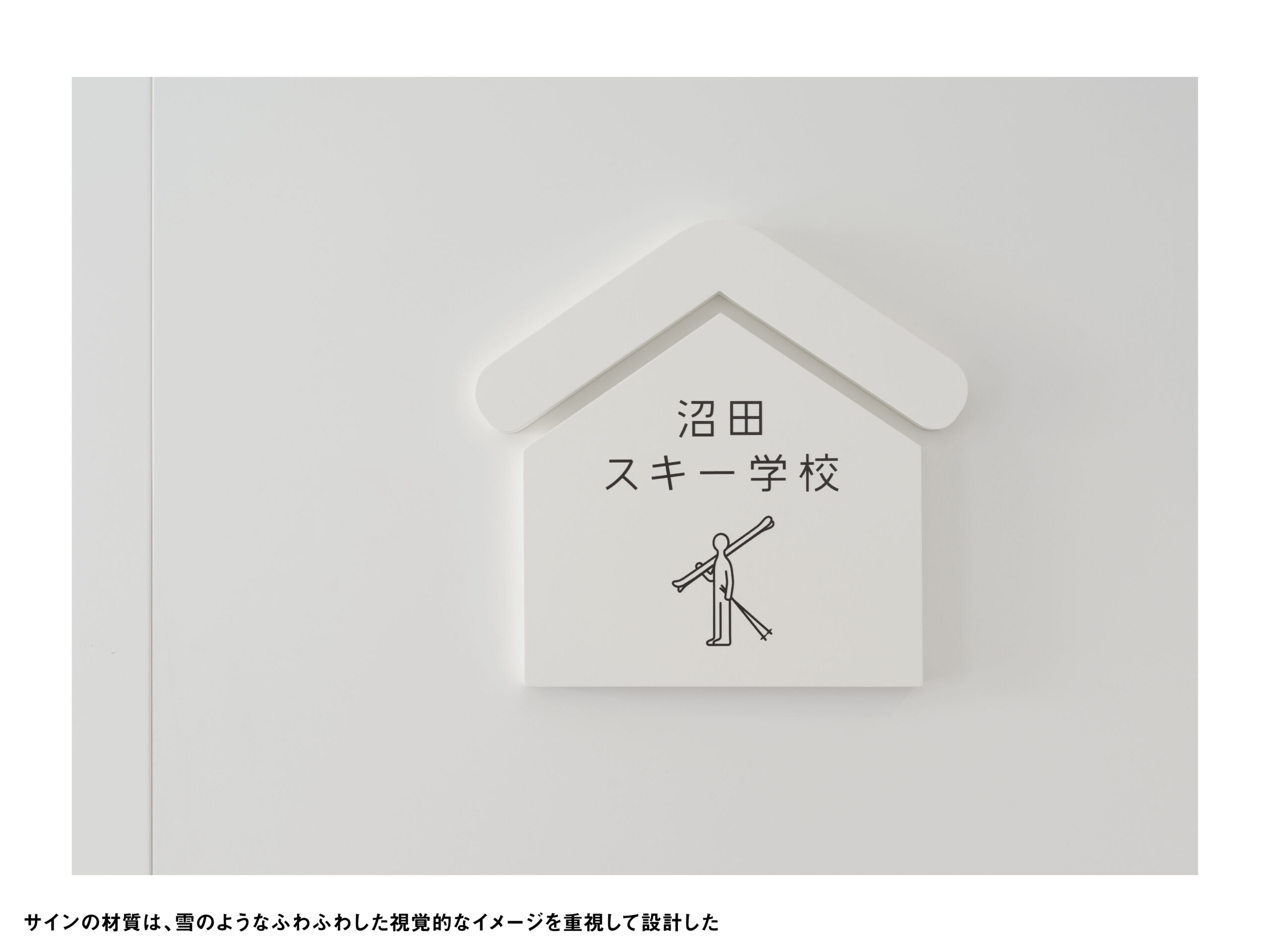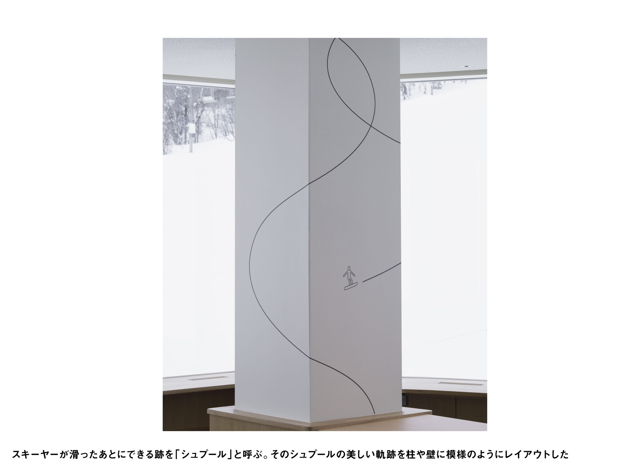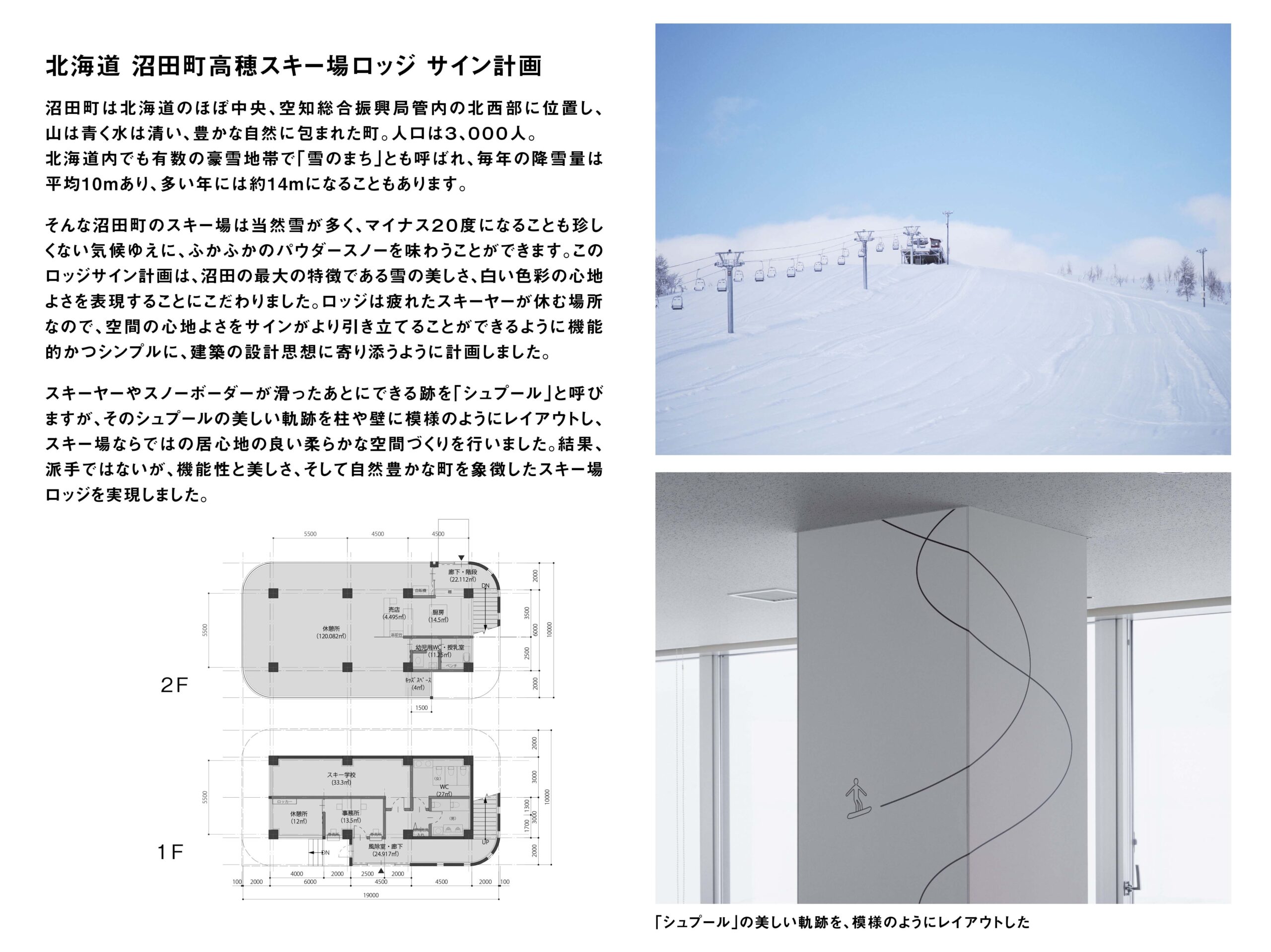 作品意図沼田町は北海道内でも有数の豪雪地帯で「雪のまち」とも呼ばれ、毎年の降雪量は平均10mあり、多い年には約14mになることもある。このサイン計画では、最大の特徴である雪の美しさと白い色彩の心地よさを表現することにこだわった。スキーヤーが滑ったあとにできる跡を「シュプール」と呼ぶが、そのシュプールの美しい軌跡を柱や壁に模様のようにレイアウトし、スキー場ならではの居心地の良い柔らカナ空間づくりを行った。