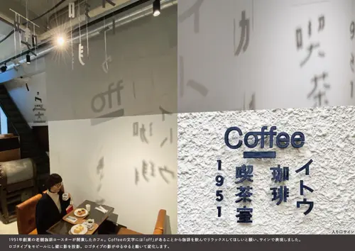 作品意図1951年創業の老舗珈琲卸会社が開業したカフェ。Coffeeの文字には「off」があることをキーにロゴマークを作成。珈琲を飲んでリラックスしてほしいとの願いをモビールのサインで表現。ロゴタイプのモビールの影が壁に投影されます。ロゴのシルエットはゆるゆると動いて変化します。影を眺めながら、ゆったりとした時間を過ごせます。小さなモビールですが投影で大きくなり限られた予算の中、大きな効果を生んでいます。