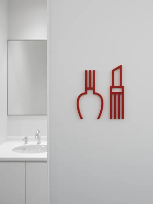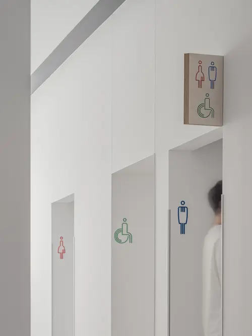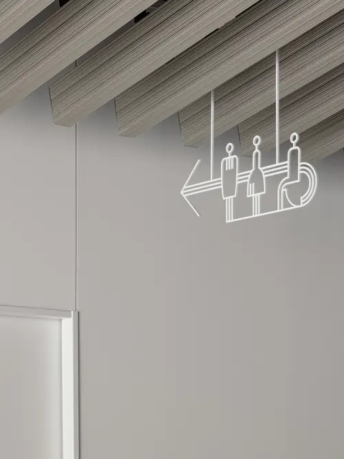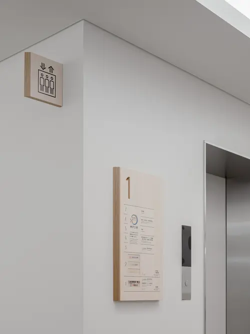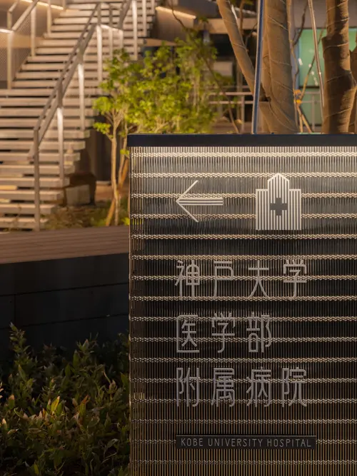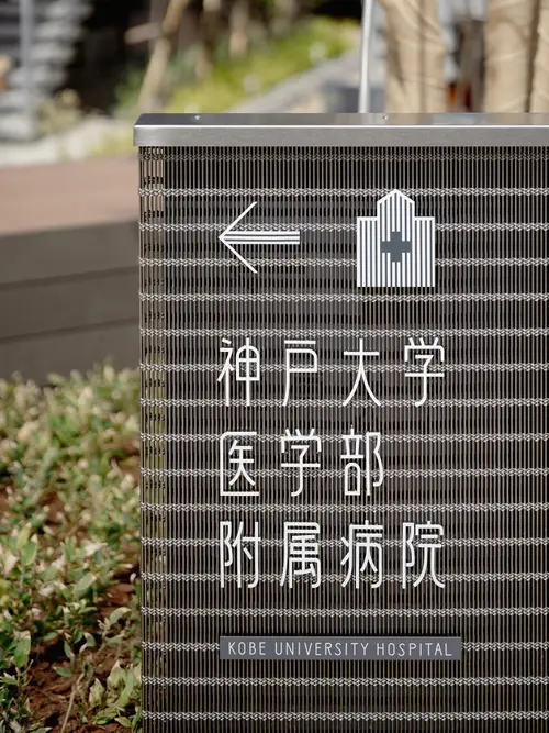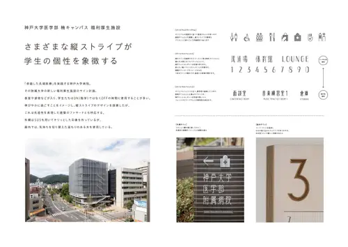 作品意図「卓越した先端医療」を実践する神戸大学病院。その附属大学の新しい福利厚生施設のサイン計画。食堂や部室などがあるため学生たちはON(勉学)ではなくOFFの時間に使用することが多い。伸びやかに過ごすことをイメージし、縦ストライプのデザインを提案したが、これは先進性を表現した建築のファサードとも呼応する。外構はSUSを用いてキリッとした印象を作っているが、屋内では、気持ちを切り替えた温もりのある木を使用。