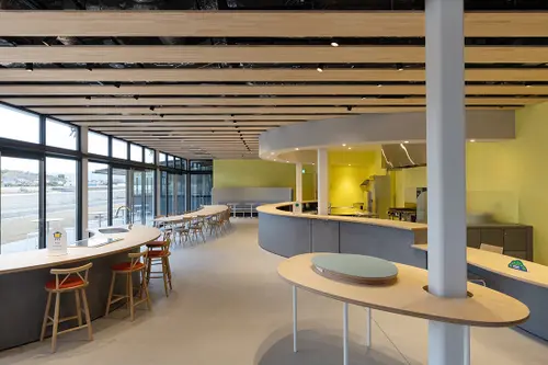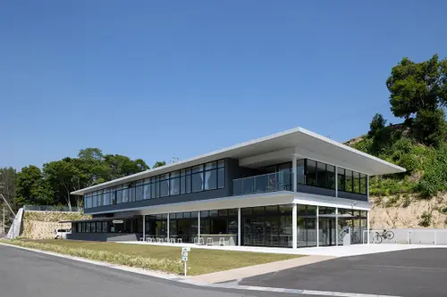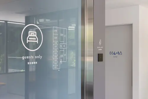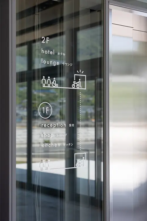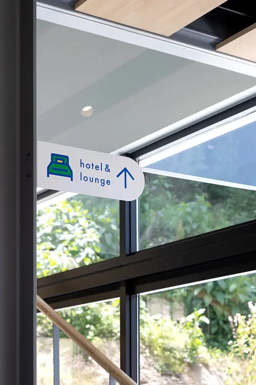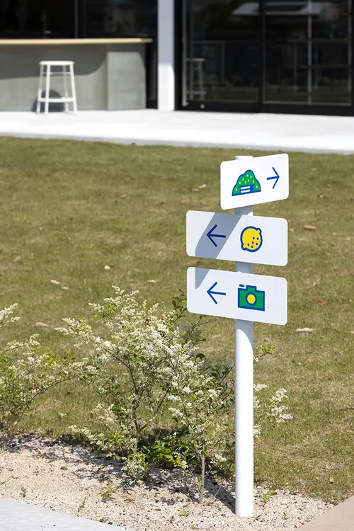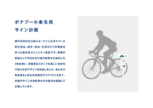 作品意図瀬戸内海の生口島にオープンしたボナプール楽生苑は、就労・宿泊・交流の3つの機能を持った複合型コミュニティ施設です。檸檬の産地として有名な生口島の風景から抽出した3色を使い、来客者もスタッフも楽しい気持ちで過ごせるデザインを目指しました。また生口島を通るしまなみ海道はサイクリストも多く、外部のサインは自転車からの視点を意識して計画しています。