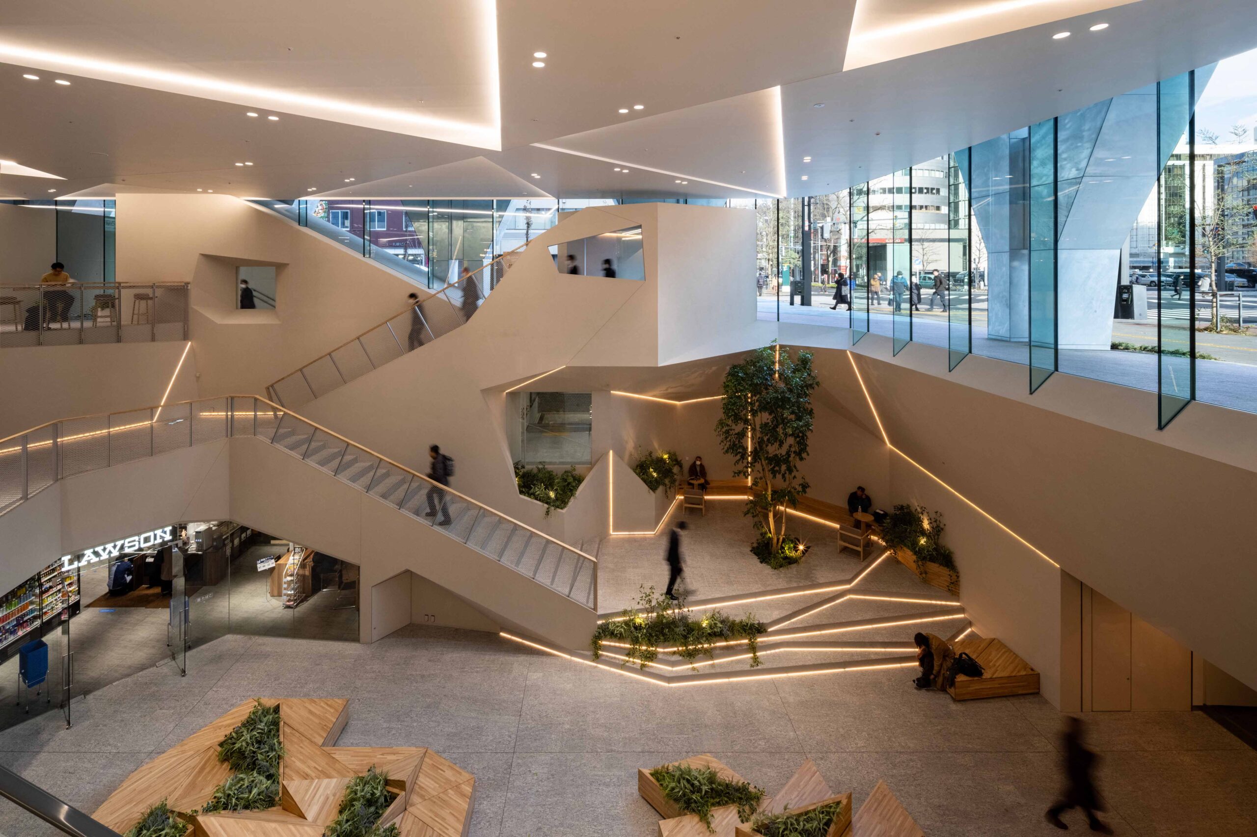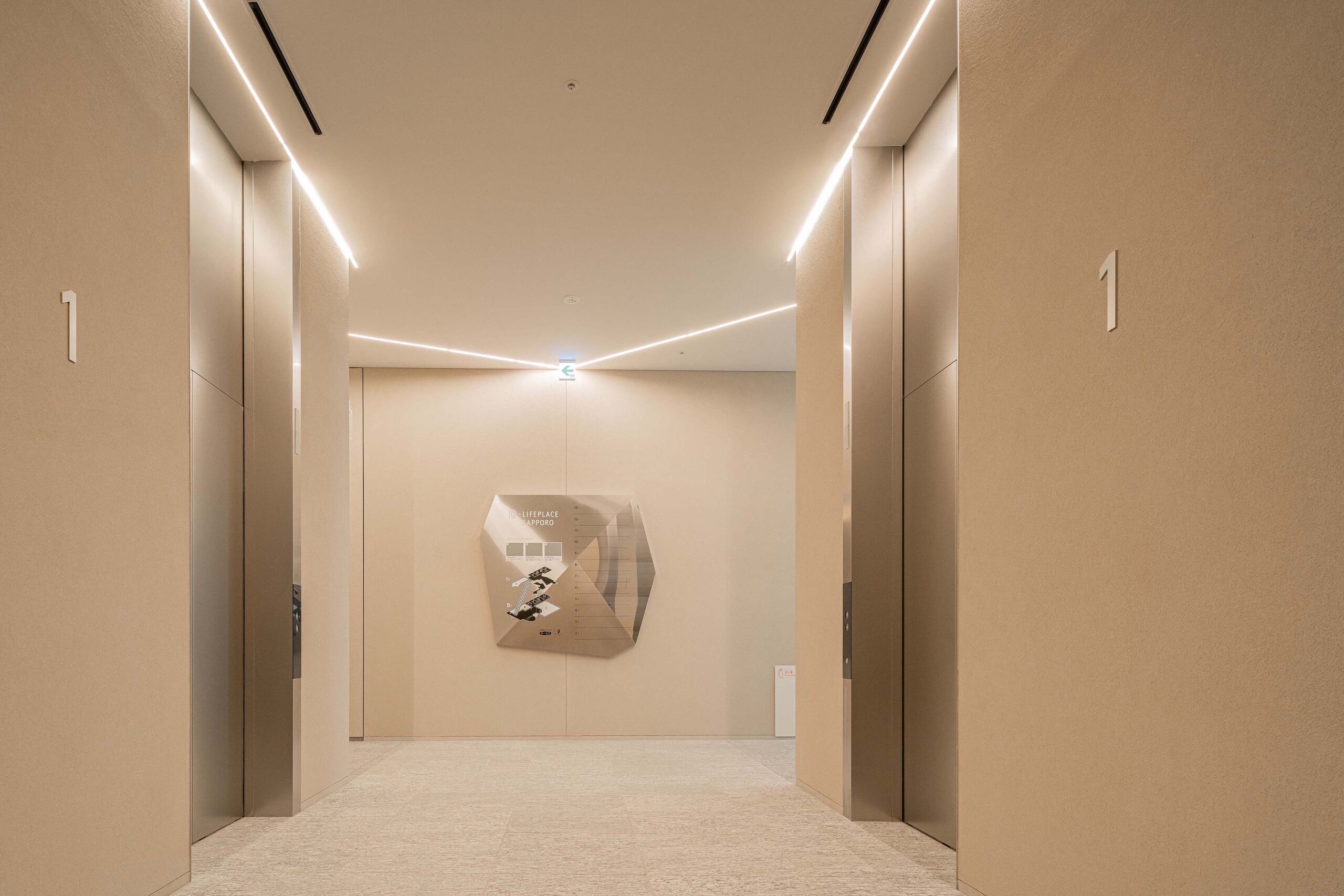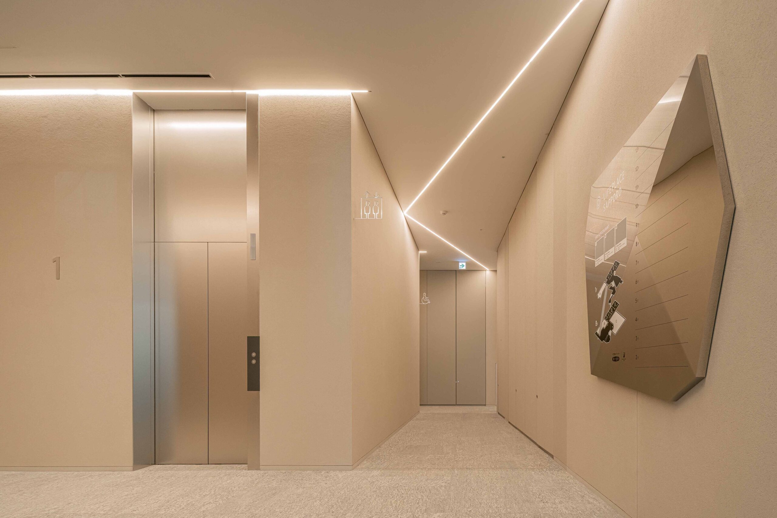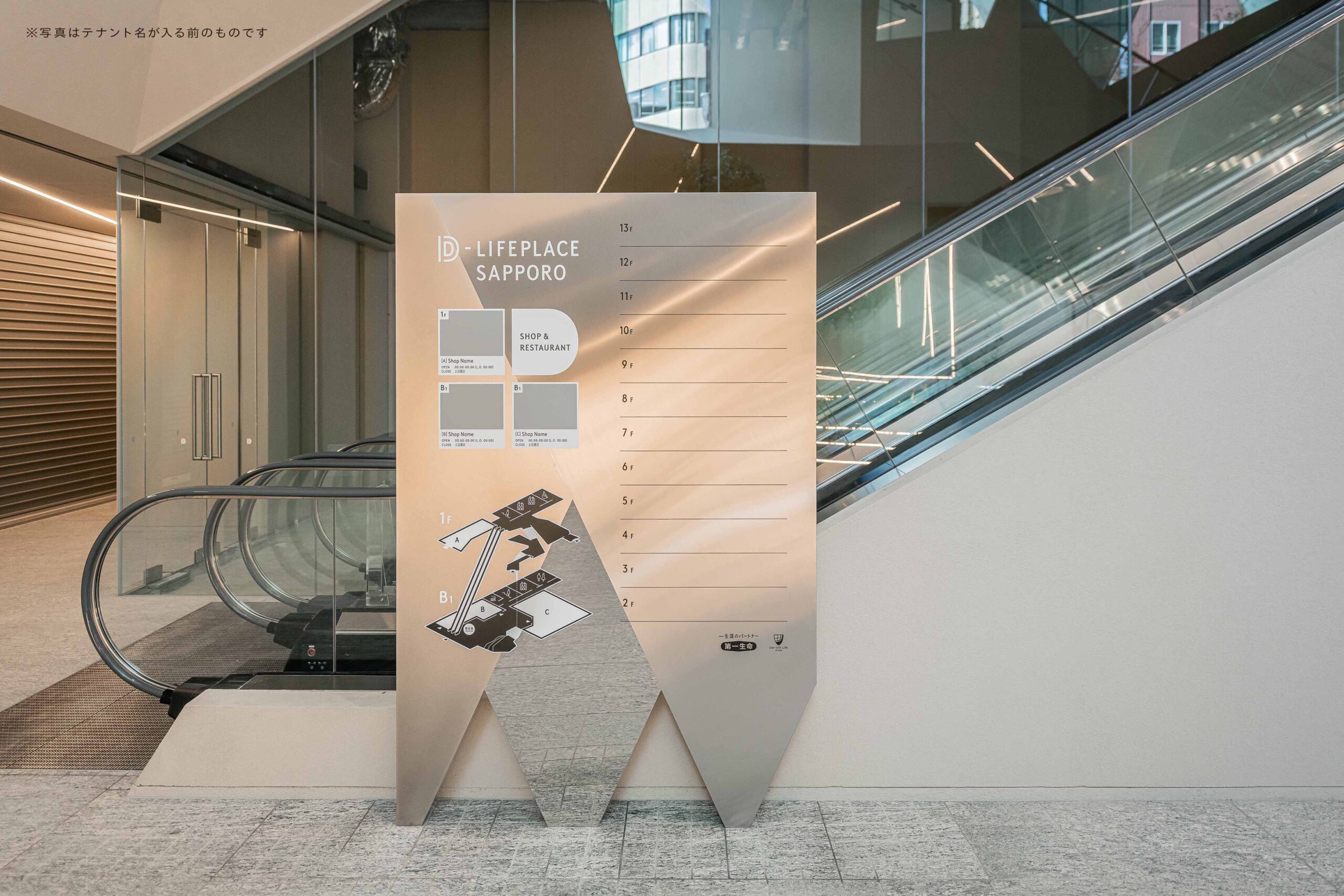 作品意図札幌駅前通のこのオフィスビルは、まちに品格と賑わいを発信する街区の顔である、地上と地下の賑わいをつなぎ、発信する場所でもある。札幌では、雪を避けるために地下を移動することも多い。総合案内サインは、地下からの来館者に、ビルのアイデンティティである特徴的なファザードが伝わるデザインとした。また、1枚のステンレスの板の中に仕上げを3種類共存させることで、さまざまな人が集まる場所の、多様性を表現している。