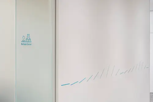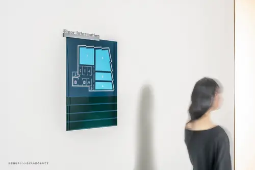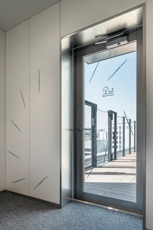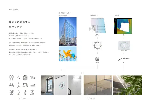 作品意図建築の風の流れを想起させるファサードと、風車形状の平面プランに合わせて、サイン計画も「風」をモチーフにしたデザインとした。ラインが回転する風車の形状から、風ように流れるグラフィック、それらが集まりピクトグラムや数字へと形を変えていく。仙台駅から程近い人の流れと賑わいある場所で、変化していく時流に乗って、風のよう軽やかにステップアップしていく新しいオフィスのあり方を表している。