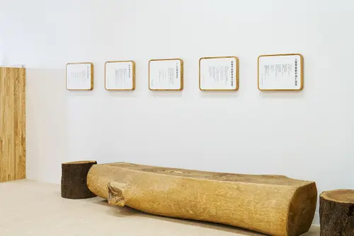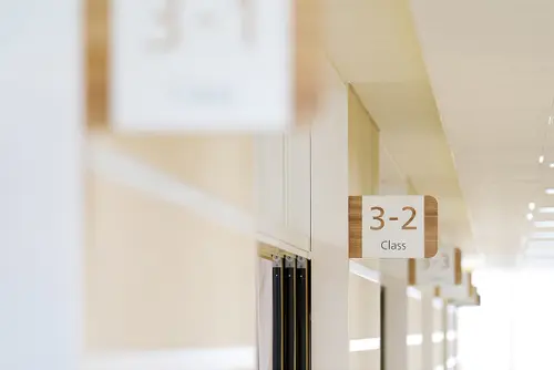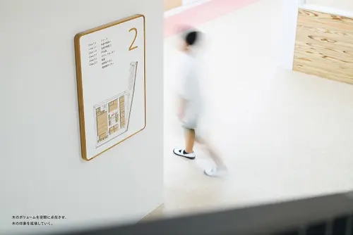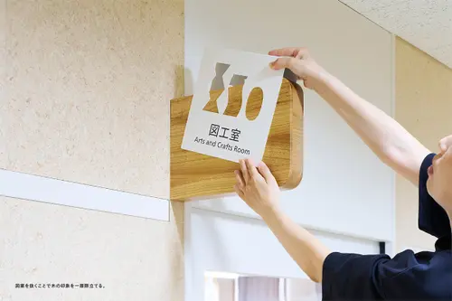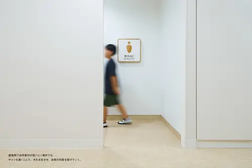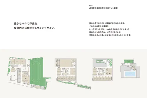 作品意図各所に豊カナ植栽が施された、豊かで気持ちの良い区立小学校。サインでは、その豊カナ自然の体験を室内に散りばめ、校舎全体で「木」の印象をつくるため、厚い木の塊でサインを展開させました。木の素材を生かすため、図案を抜き型にし、木の素地がのぞく表示方法にしています。ここに通う子どもたちが、気持ちのよい学校だったなと、いずれ思い返すための一助になれればと思います。