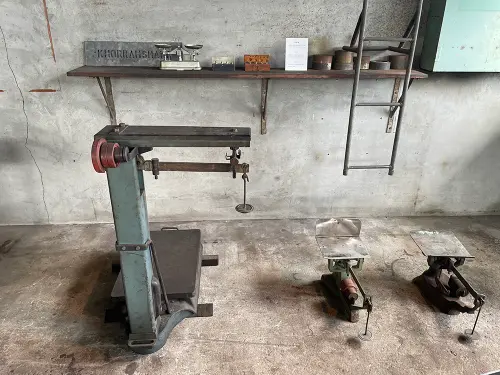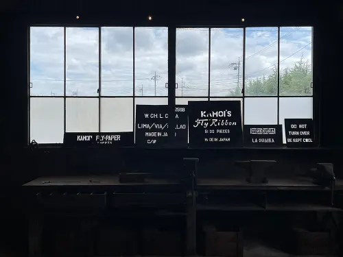 何を伝えようとしているのか核心がつかめなかった。古き時代の職人的仕事ぶりを残す町工場は全国にごまんとある。そこで使われる工具や部品も長きにわたり使いこなされていれば魅力を感じる。これらをアクリルに埋め込み保存するというディスプレイも新鮮なわけではない。かつて使われていたステンシルのテンプレートも道具の一つに過ぎない。何をどのように作っていたのか・・・この「窯場・工作室」のストーリーがまったく読めない。「ハエ取り紙の製造工場だよ」「マスキングテープの原点だよ」なるほど、テープメーカーの会社訪問における歴史的遺構見学コースであった。全体を想像すれば何気なさの意味が分かる。