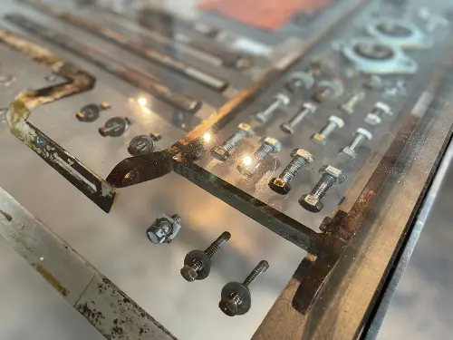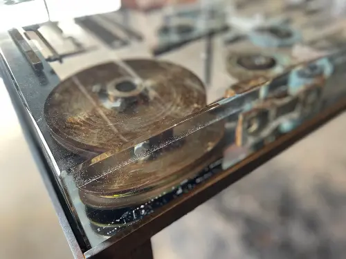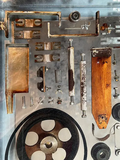 機械の構造や部品を見せるために分解し、アクリル樹脂で全てのパーツを固め、