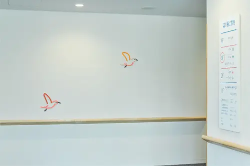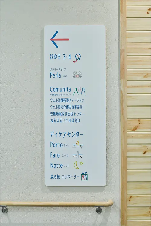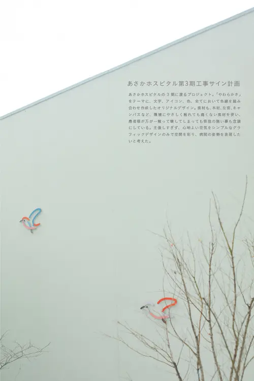 作品意図あさかホスピタルの3期に渡るプロジェクト。「やわらかさ」をテーマに、文字、アイコン、色、全てにおいて色線を組み合わせ作成したオリジナルデザイン。素材も、木材、左官、キャンバスなど、環境にやさしく触れても痛くない素材を使い、患者様が万が一触って壊してしまっても怪我の無い事も念頭にしている。主張しすぎず、心地よい空気をシンプルなグラフィックデザインのみで空間を彩り、病院の姿勢を表現したいと考えた。