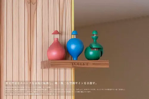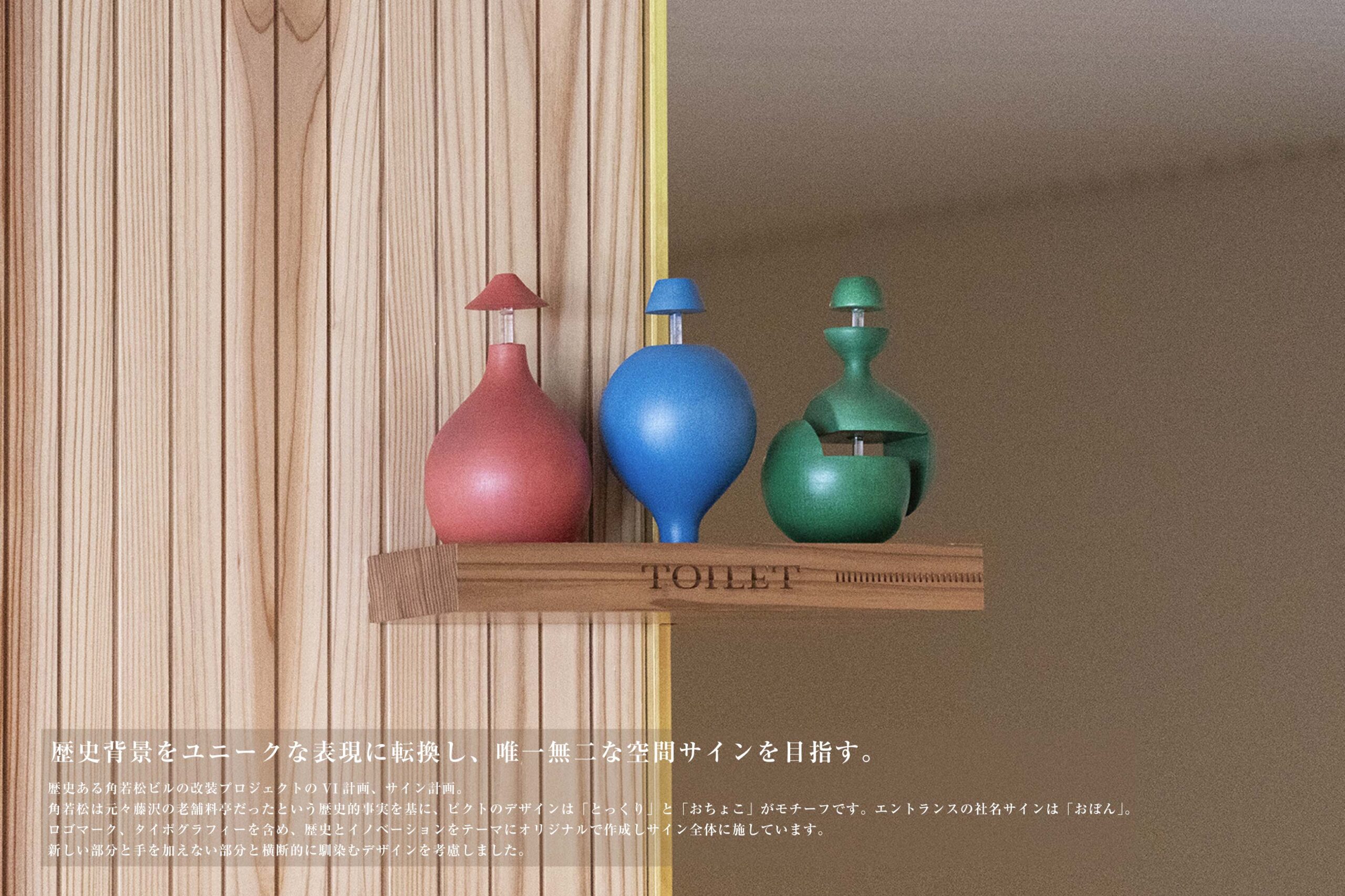 作品意図歴史ある角若松ビルの改装プロジェクトのVI計画、サイン計画。角若松は元々藤沢の老舗料亭だったという歴史的事実を基に、ピクトのデザインは「とっくり」と「おちょこ」がモチーフです。エントランスの社名サインは「おぼん」。ロゴマーク、タイポグラフィーを含め、歴史とイノベーションをテーマにオリジナルで作成しサイン全体に施しています。新しい部分と手を加えない部分と横断的に馴染むデザインを考慮しました。