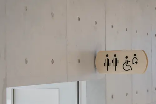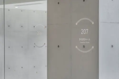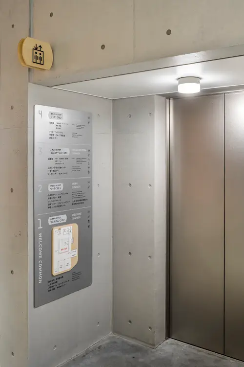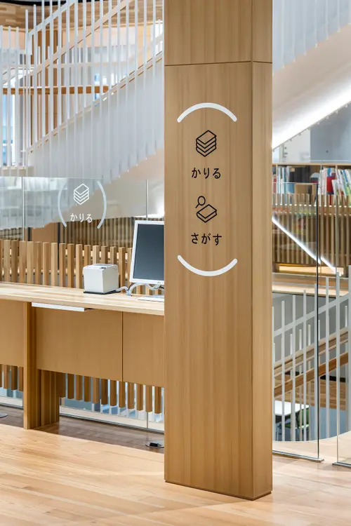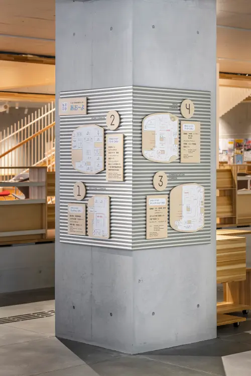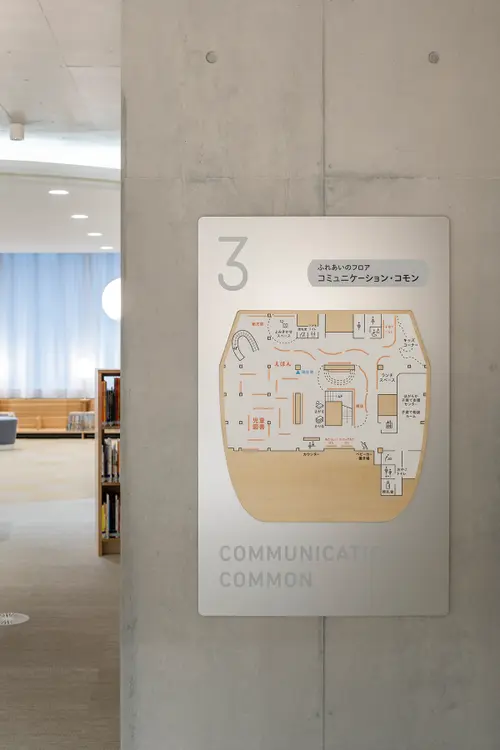 作品意図この施設の建築ファサードはアルミの雨樋でできている。富山県には水力発電による豊富な電力と富山湾の水があり、ボーキサイトの輸入をする大型船が停泊できる港などアルミに必要な要素を備えていたのでアルミ産業が発展してきた。サイン計画も、それに倣いアルミパイプやアルミの板を利用してサインで展開している。