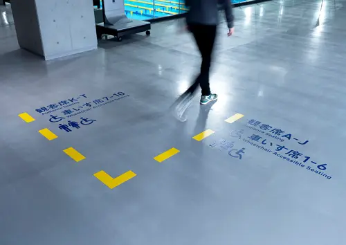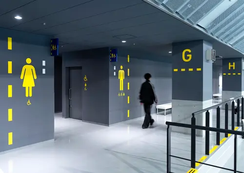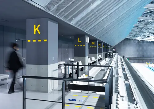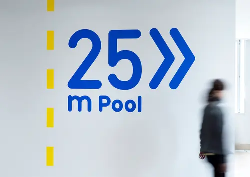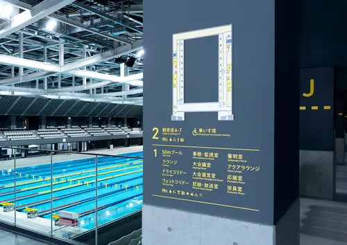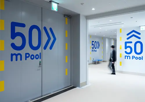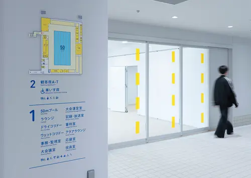 青森県に新設された、青森県立水泳場のサイン計画です。コースロープをモチーフにしたグラフィックを使い、サインを強調しながら空間の演出も行いました。隣接する25mプールと50mプールを行き来する巨大なコリドーに大胆に誘導サインを展開し、アクティブなスポーツ体験を提供する場として、訪れたプール利用者の気持ちを高揚させます。