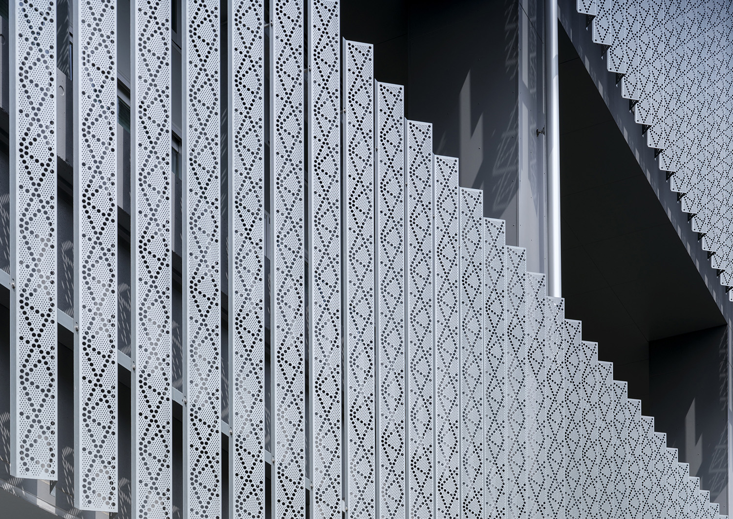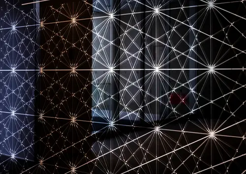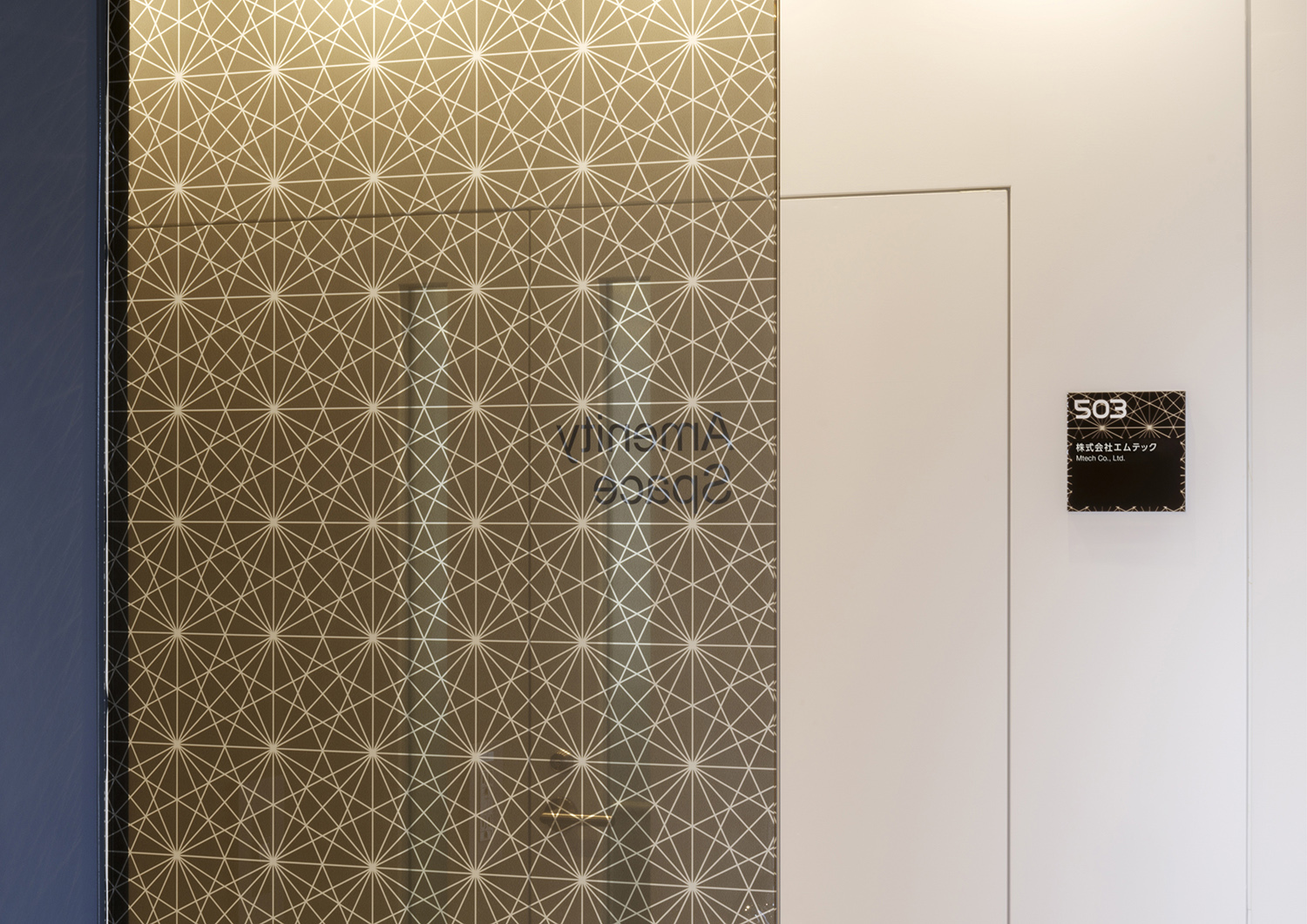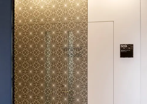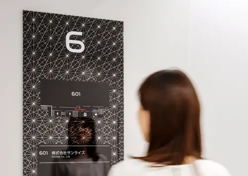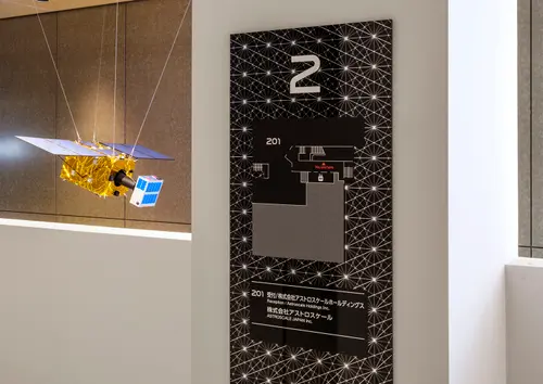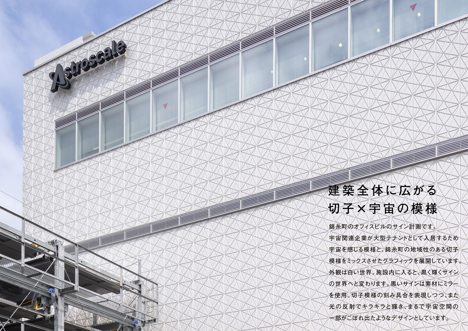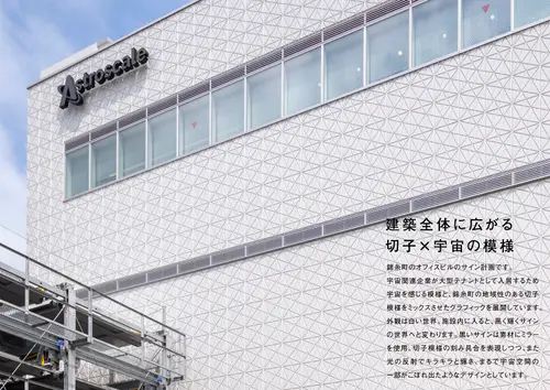 作品意図錦糸町のオフィスビルのサイン計画です。宇宙関連企業が大型テナントとして入居するため宇宙を感じる模様と、錦糸町の地域性のある切子模様をミックスさせたグラフィックを展開しています。外観は白い世界。施設内に入ると、黒く輝くサインの世界へと変わります。黒いサインは素材にミラーを使用。切子模様の刻み具合を表現しつつ、また光の反射でキラキラと輝き、まるで宇宙空間の一部がこぼれ出たようなデザインとしています。