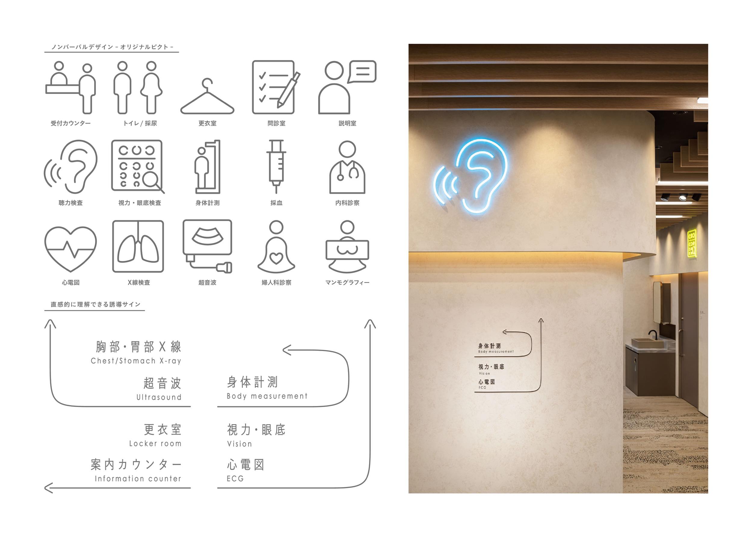 居心地の良さとは、快適で健康な空間であることはもちろんのこと、その場所で過ごす時間に違和感を覚えないことと考え、次の健診がどこで行われるのか分かりづらいといった違和感の解消を目的とした直感的に理解できるサイン計画と、渋谷の街を切り取ったアートワークを空間にちりばめることで、この場所ならではの、真に心地よく過ごせる空間を実現した。