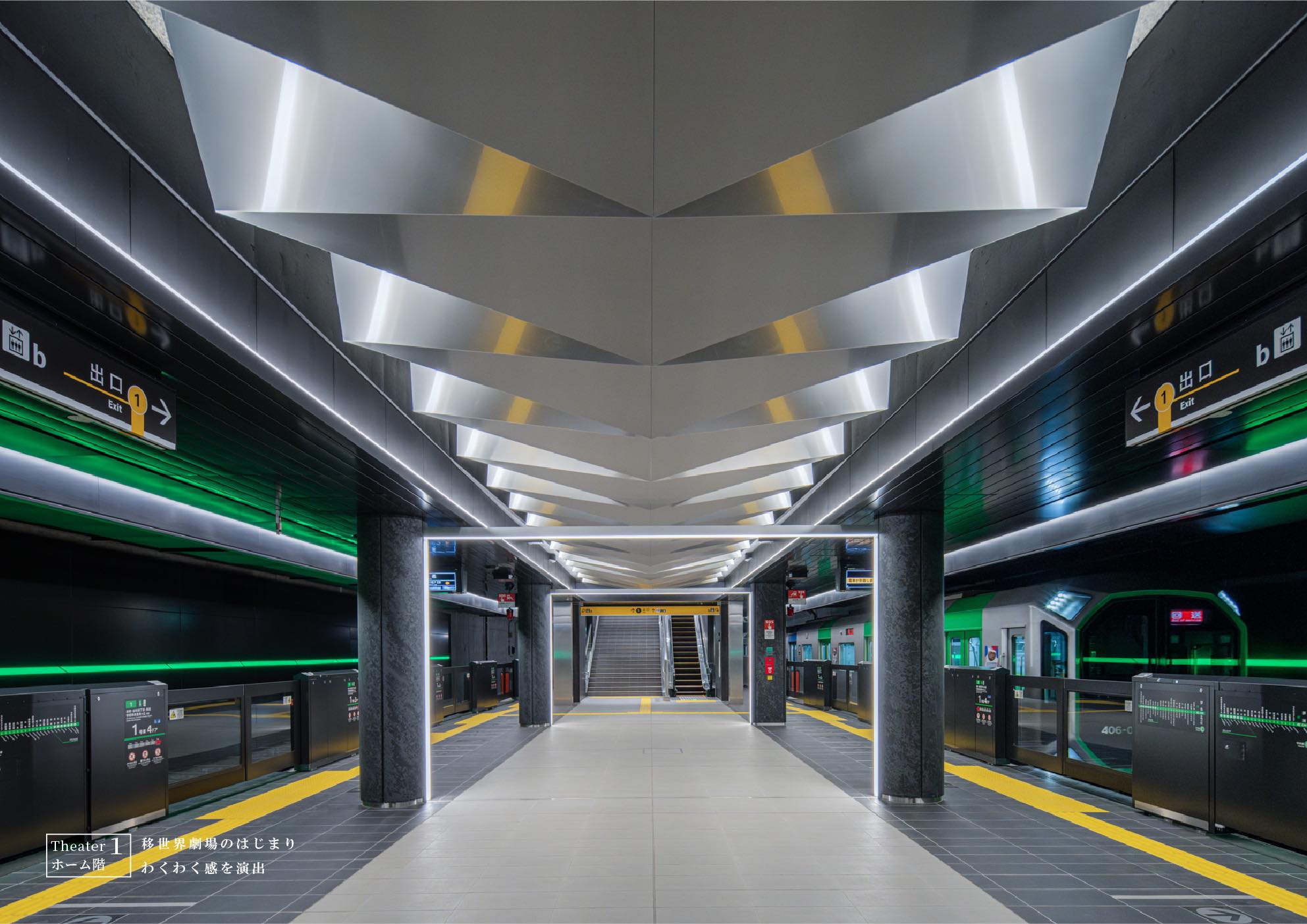 作品意図万博やIR整備が進む国際観光拠点の玄関として、パビリオンの一つとなり、目的となる駅。コンセプトは移世界劇場。まちや人々を動かしてきたOsaka Metroならではの“動く(いきる)=移動”の魅力を発信する駅を、日本文化の要素を用い創り上げた。運行ダイヤ図を表現した鏡面の折り紙天井、人々の姿、サイネージ、門型照明により生まれる空間を体感しながら、まちへ導かれる。自然と人の流れを生む空間を目指した。